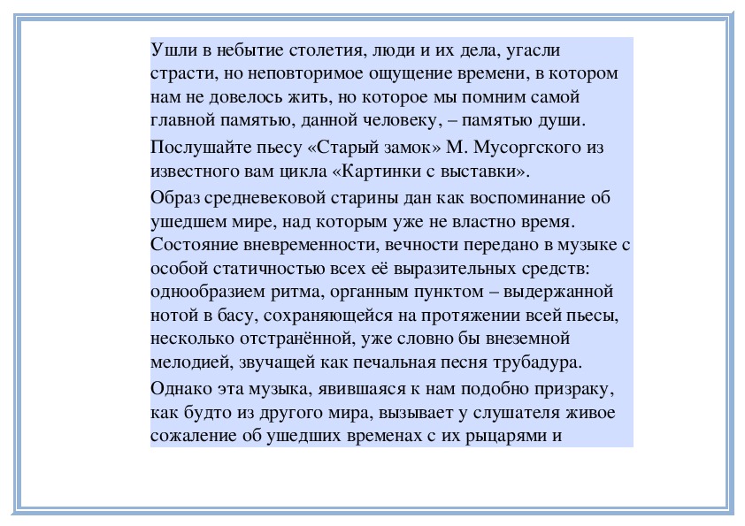 Послушайте пьесу «Старый замок» М. Мусоргского из