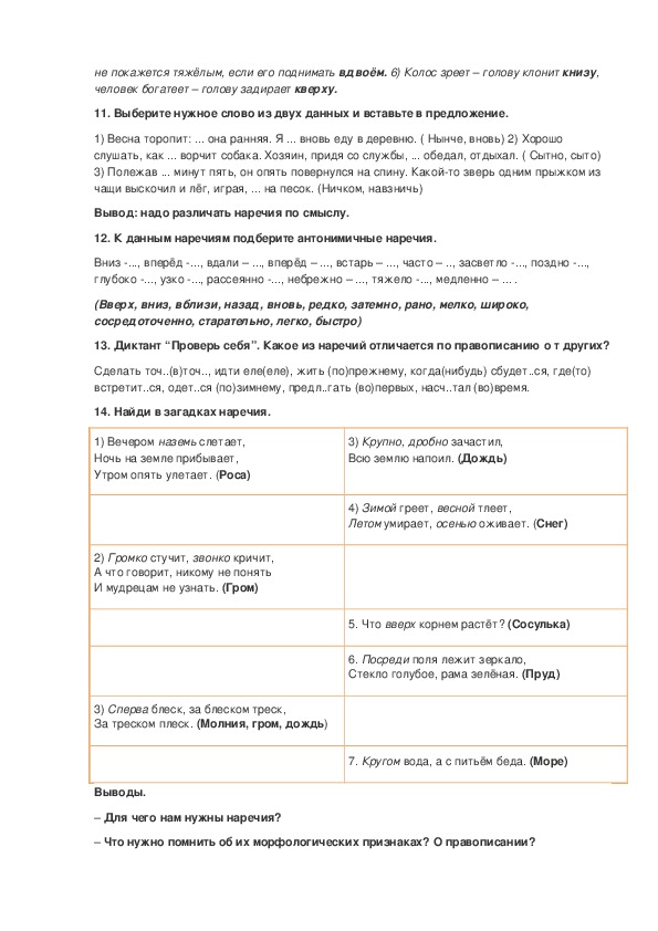 (Вверх, вниз, вблизи, назад, вновь, редко, затемно, рано, мелко, широко,