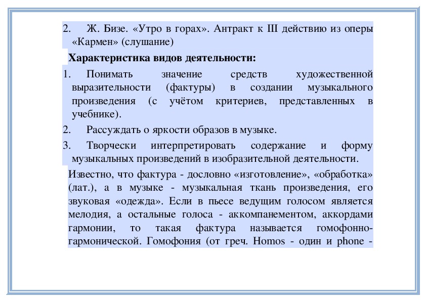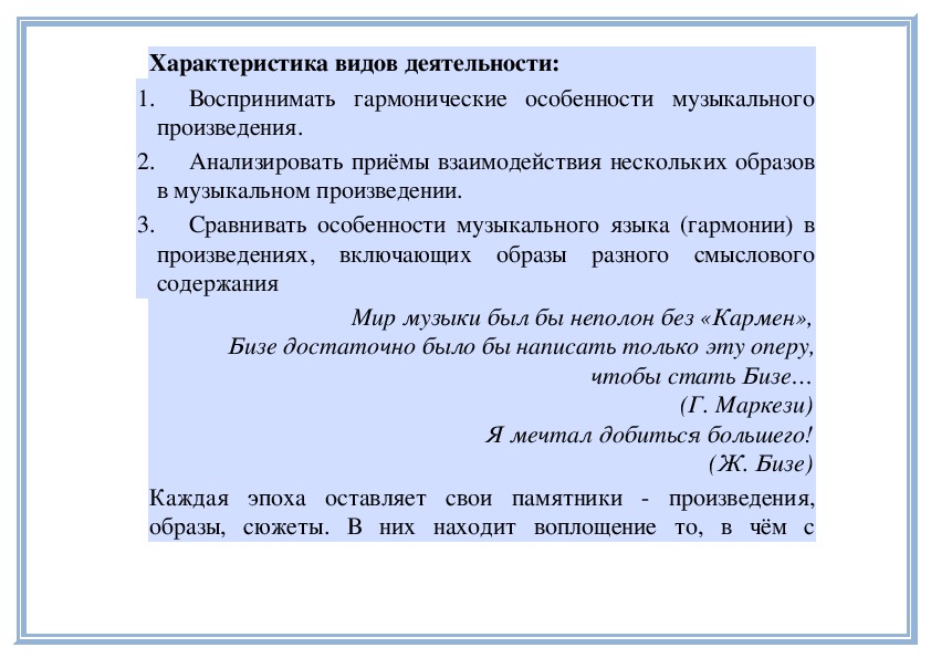 1. Ж. Бизе. Увертюра к опере «Кармен» (слушание).Характеристика видов деятельности: