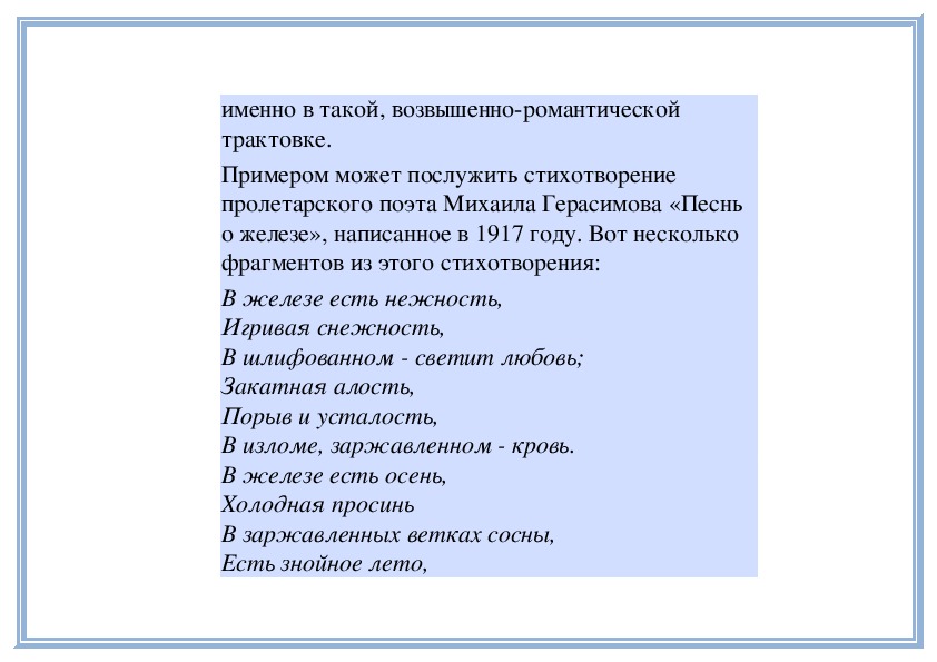 4. Романтизация индустриальной темы в искусстве (на примере стихотворения М. Герасимова «Песнь о железе»).