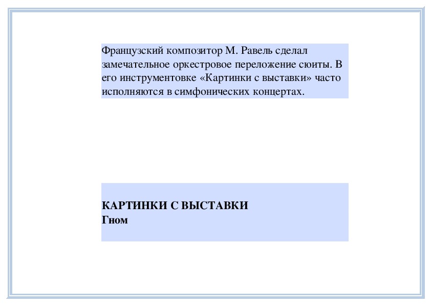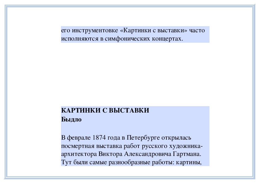 «Картинки с выставки» — широко известная сюита М. П. Мусоргского из 10 пьес с интермедиями, созданная в 1874 году в память о друге Мусоргского художнике и архитекторе В. А. Гартмане. Изначально написанная для фортепиано, она неоднократно аранжировалась различными композиторами для оркестра и обрабатывалась в самых разных музыкальных стилях.
