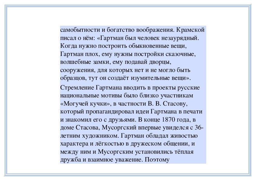 архитектуре. Его отличали стремление к русскойсамобытности и богатство воображения. Крамской