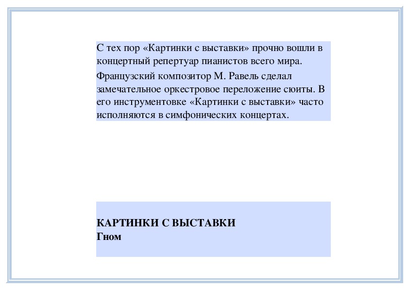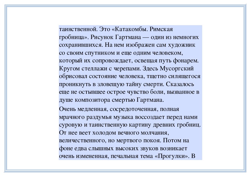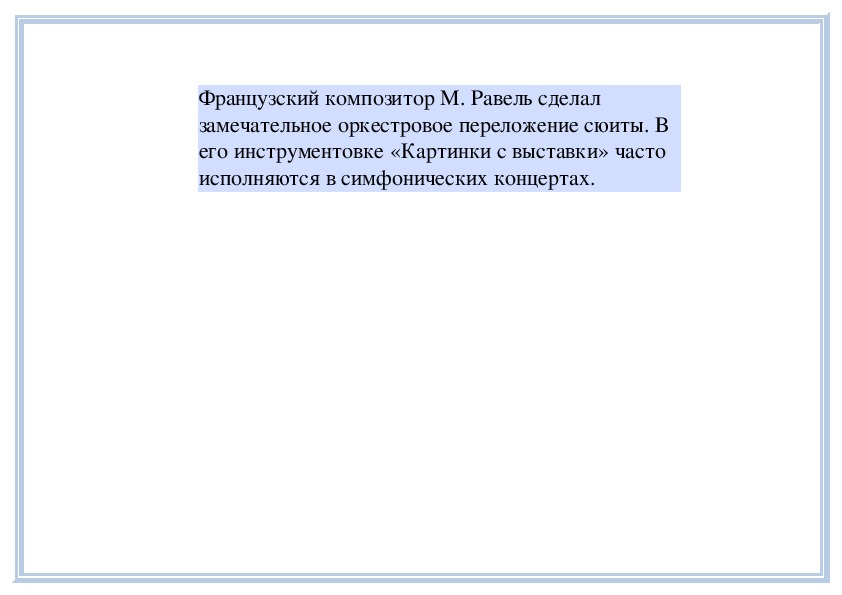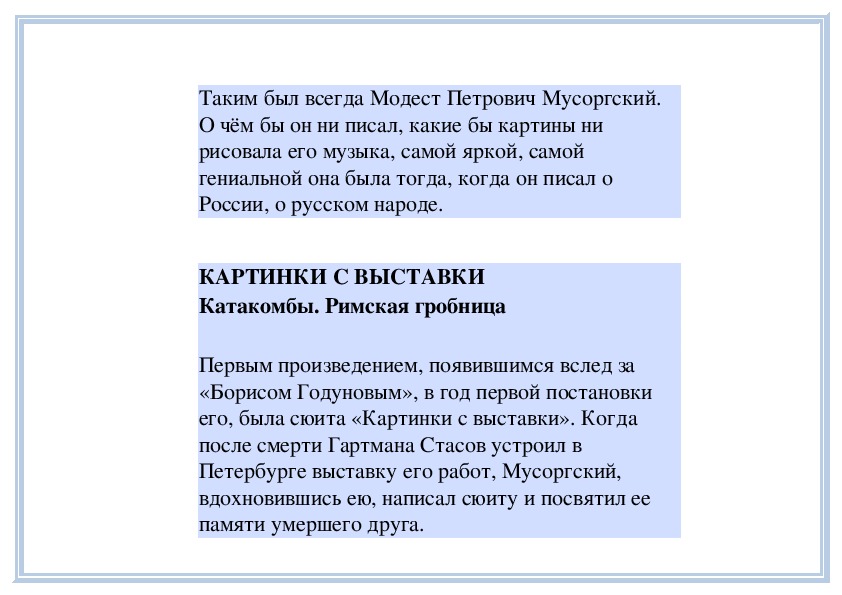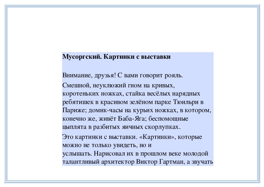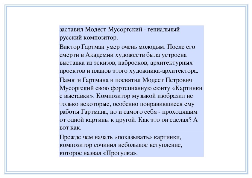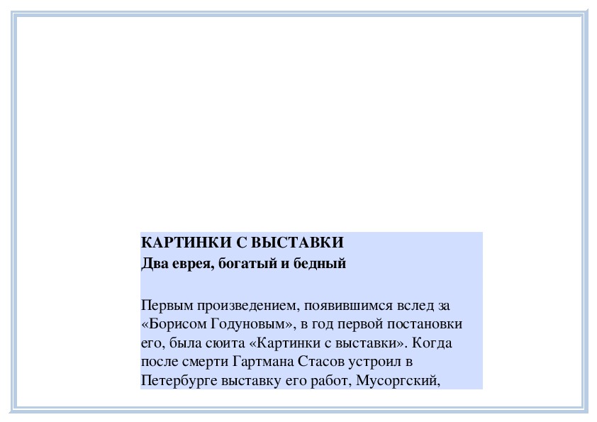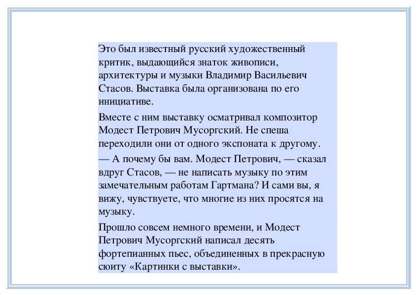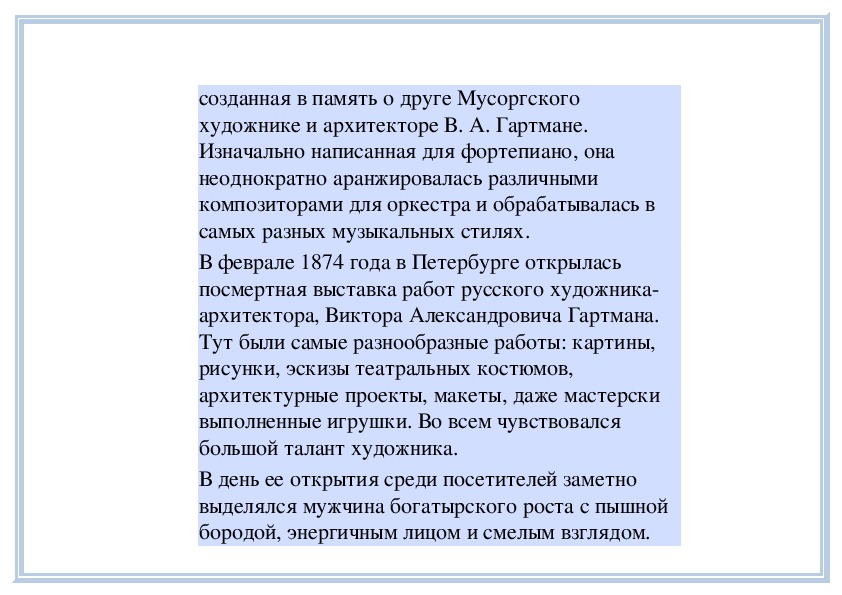 заграничных путешествий.Посещение Мусоргским выставки послужило
