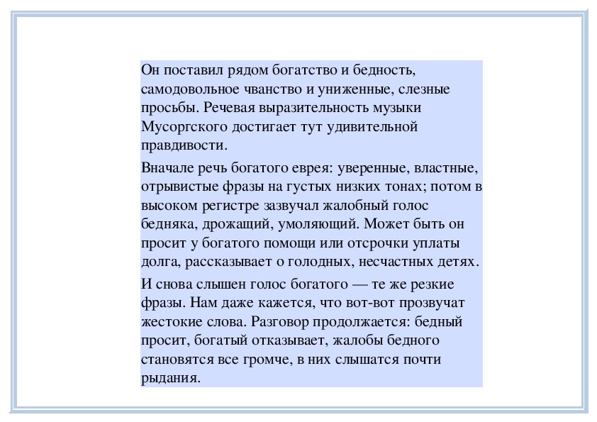разбегаются». Все это замечательно передано вмузыке Мусоргского. Здесь уже нет песенных