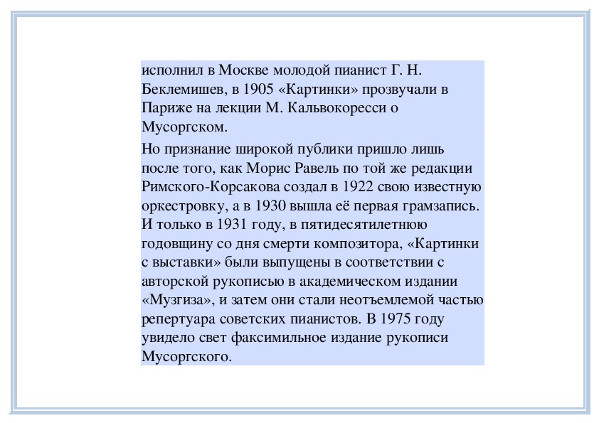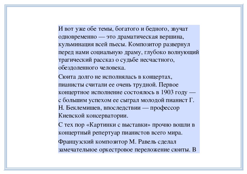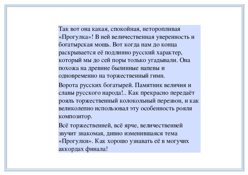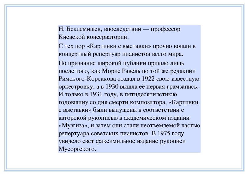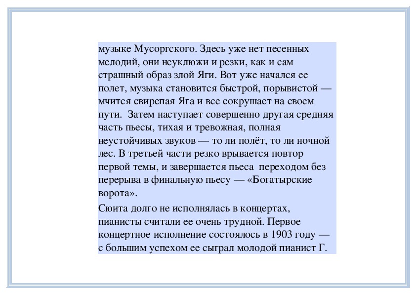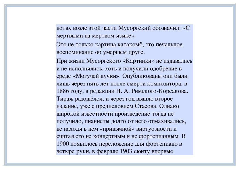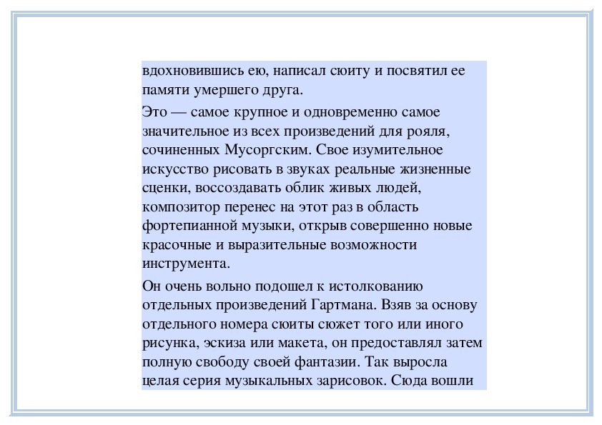 Это — самое крупное и одновременно самое значительное из всех произведений для рояля, сочиненных Мусоргским. Свое изумительное искусство рисовать в звуках реальные жизненные сценки, воссоздавать облик живых людей, композитор перенес на этот раз в область фортепианной музыки, открыв совершенно новые красочные и выразительные возможности инструмента.