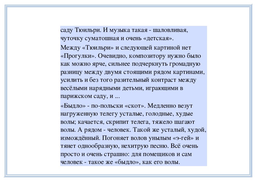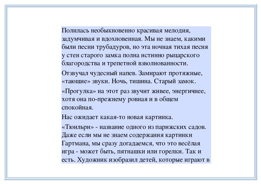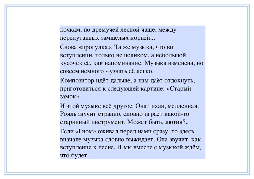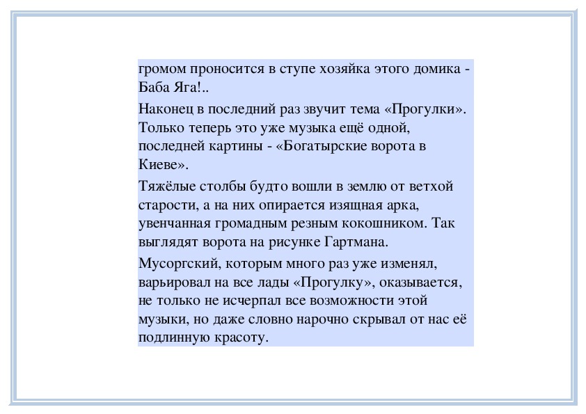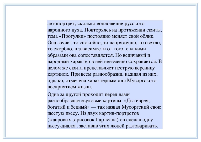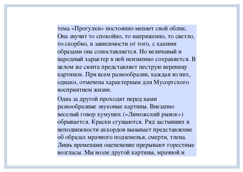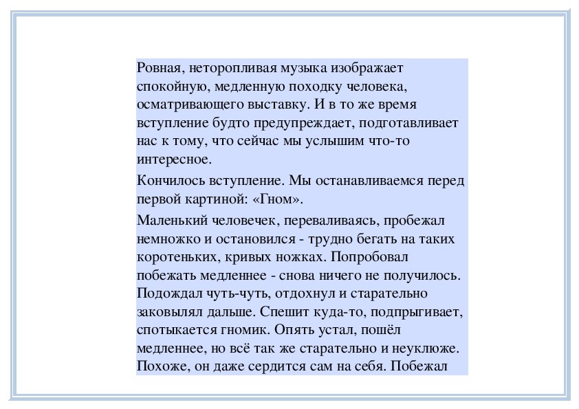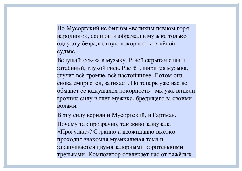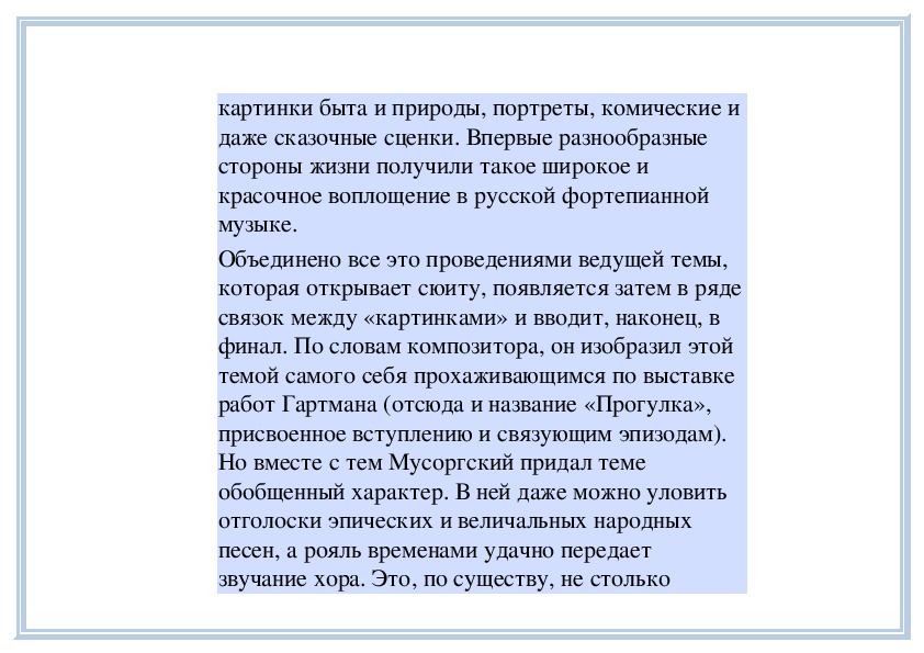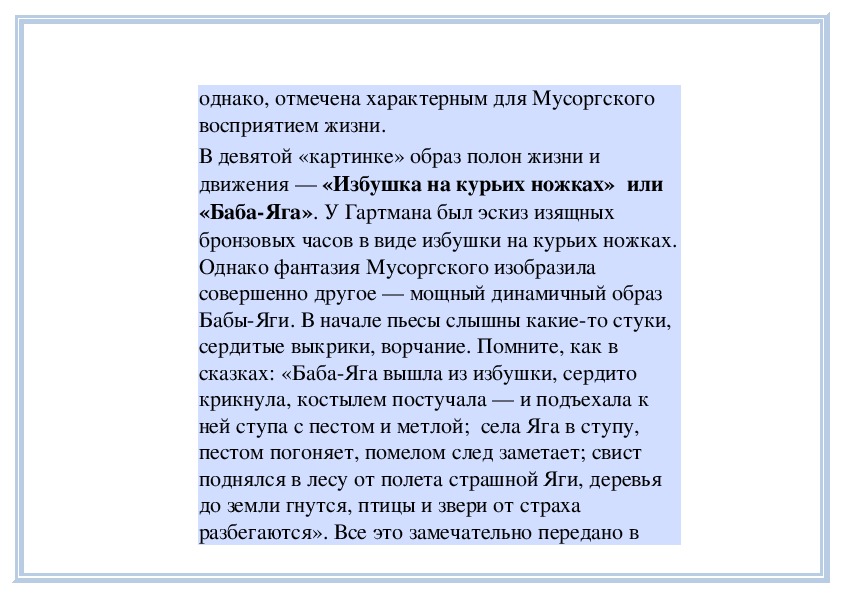 картинок. При всем разнообразии, каждая из них,однако, отмечена характерным для Мусоргского