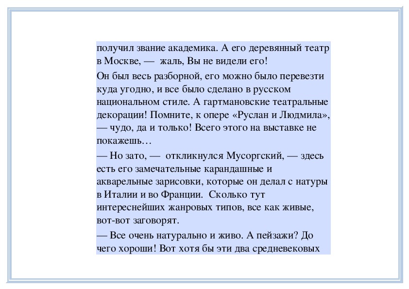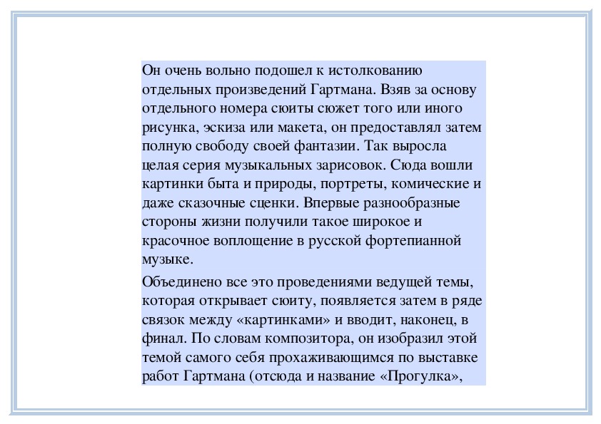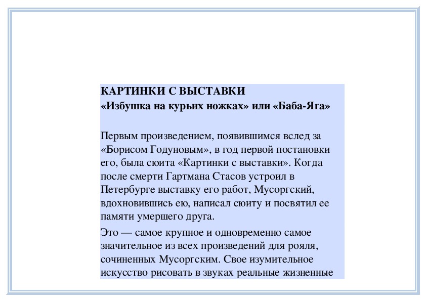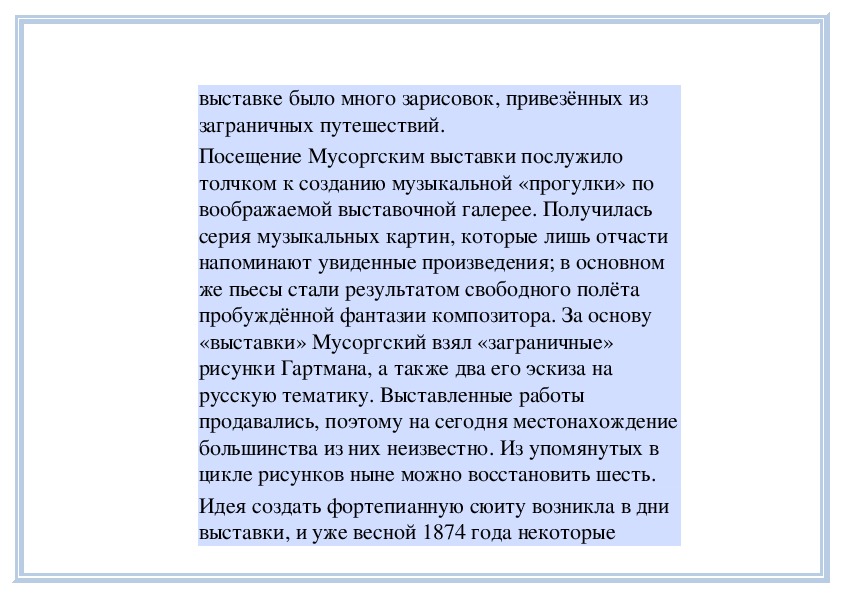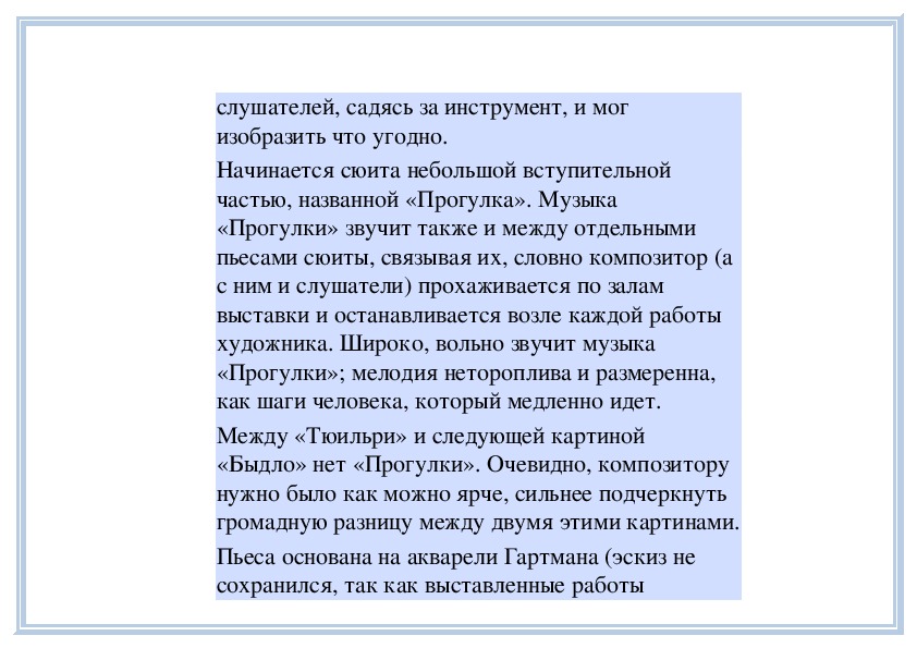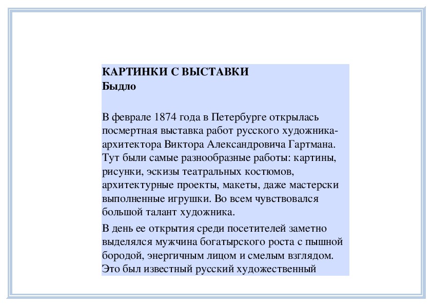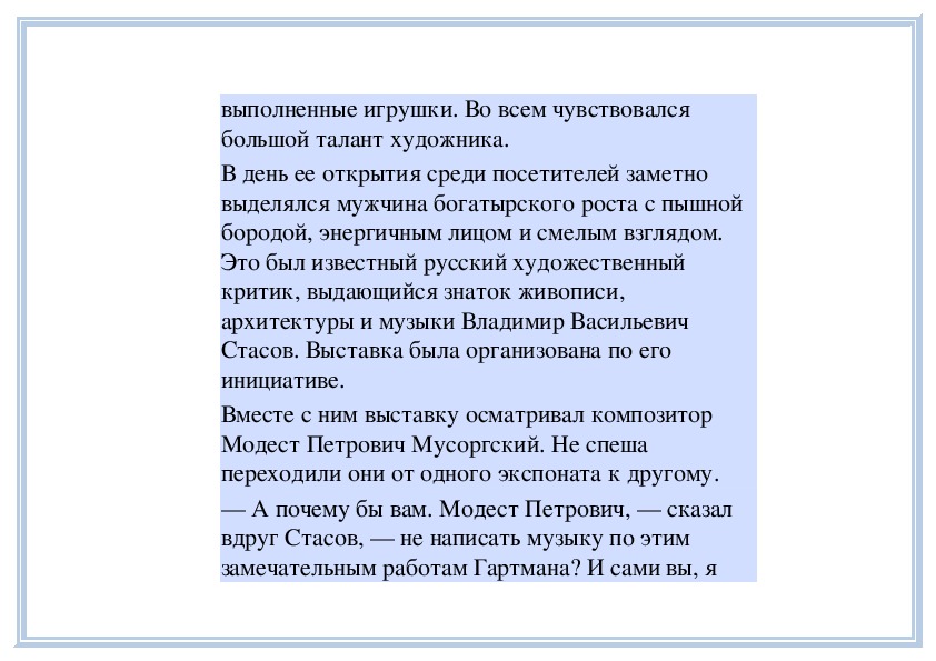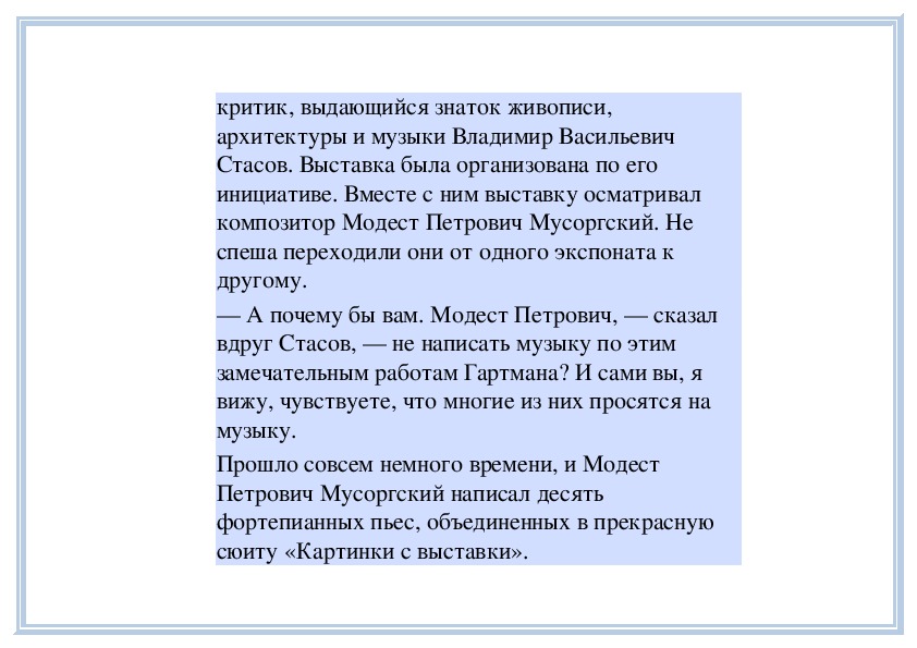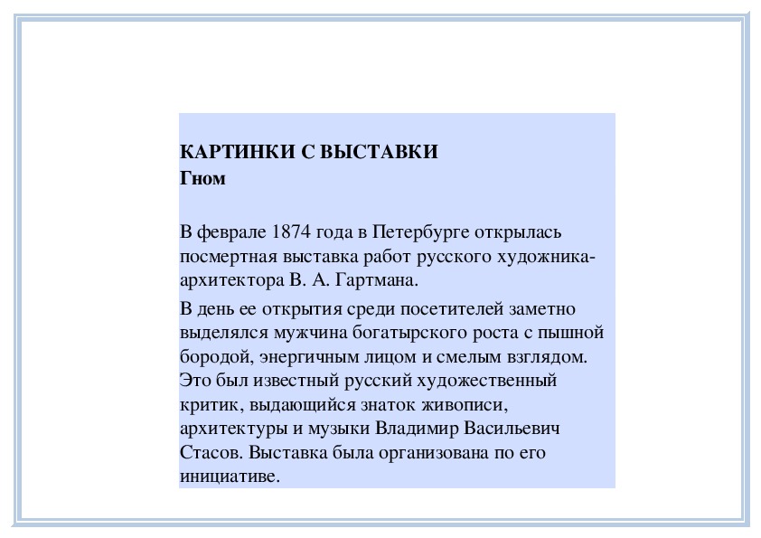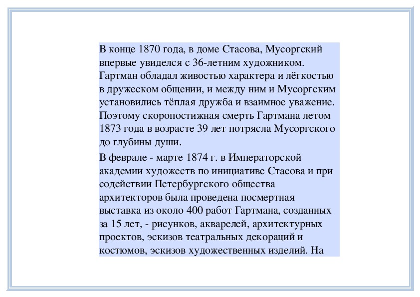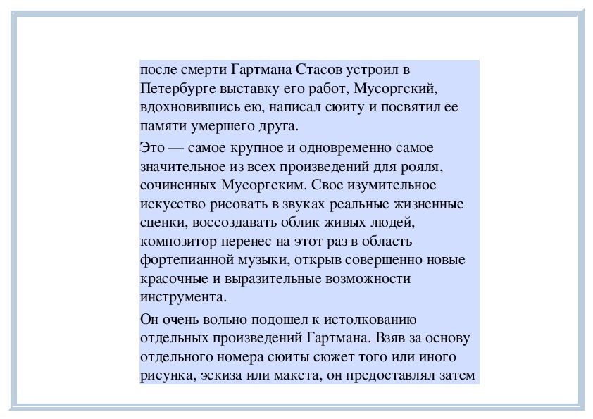 его, была сюита «Картинки с выставки». Когдапосле смерти Гартмана Стасов устроил в
