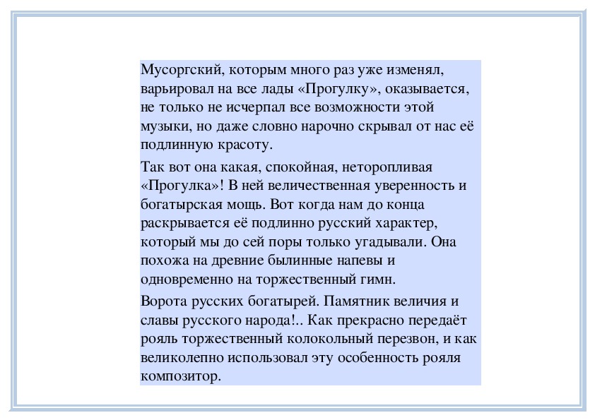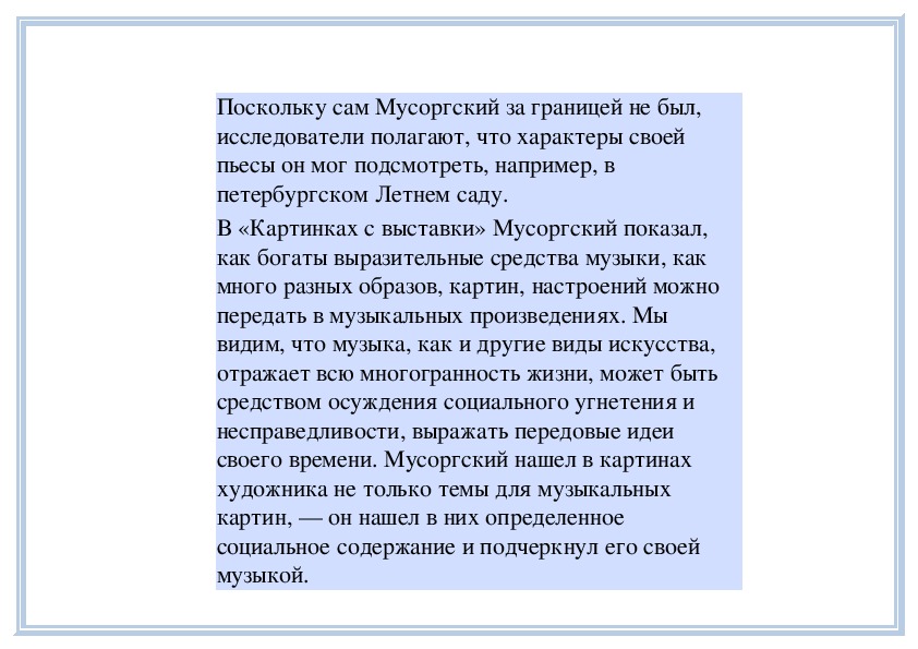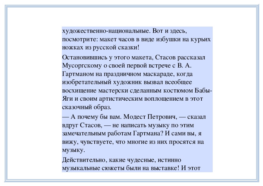 самобытности и богатство воображения.В конце 1870 года, в доме Стасова, Мусоргский