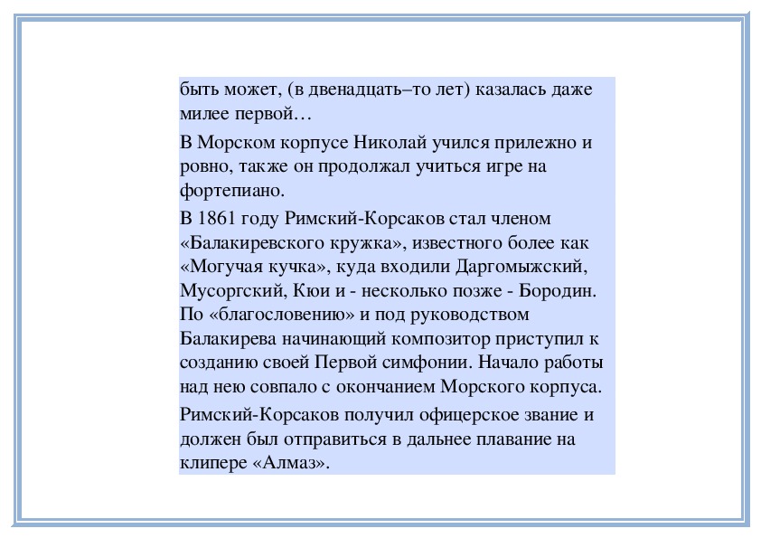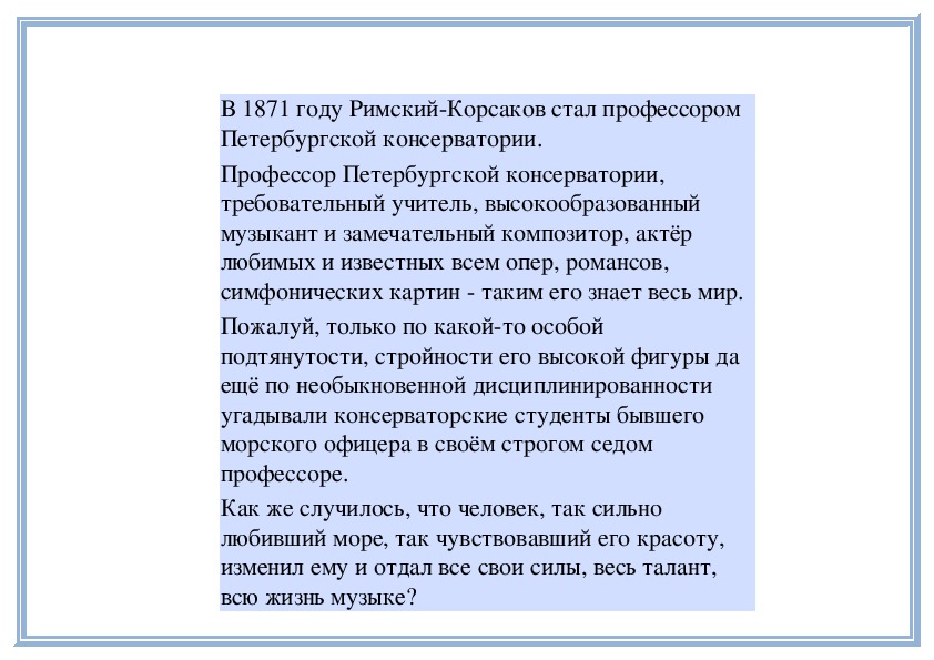 он, она будет связана не с морем, но с музыкой.В 1871 году РимскийКорсаков стал профессором