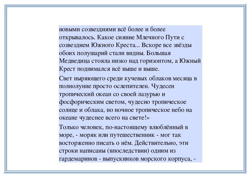 «Мы вступили в полосу северо-восточного пассата и вскоре пересекли тропик Рака. Чудная погода, ровный, тёплый ветер, легко взволнованное море, тёмно-лазоревое небо с белыми кучевыми облаками не изменялось во всё время перехода по благодатной полосе пассата. Чудные дни и чудные ночи! Дивный, тёмно-лазоревый днём цвет океана сменялся фантастическим фосфорическим свечением ночью.