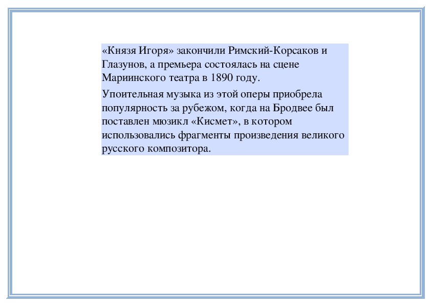 безрезультатно. Он призывал композиторавернуться к оркестровке Половецких плясок,