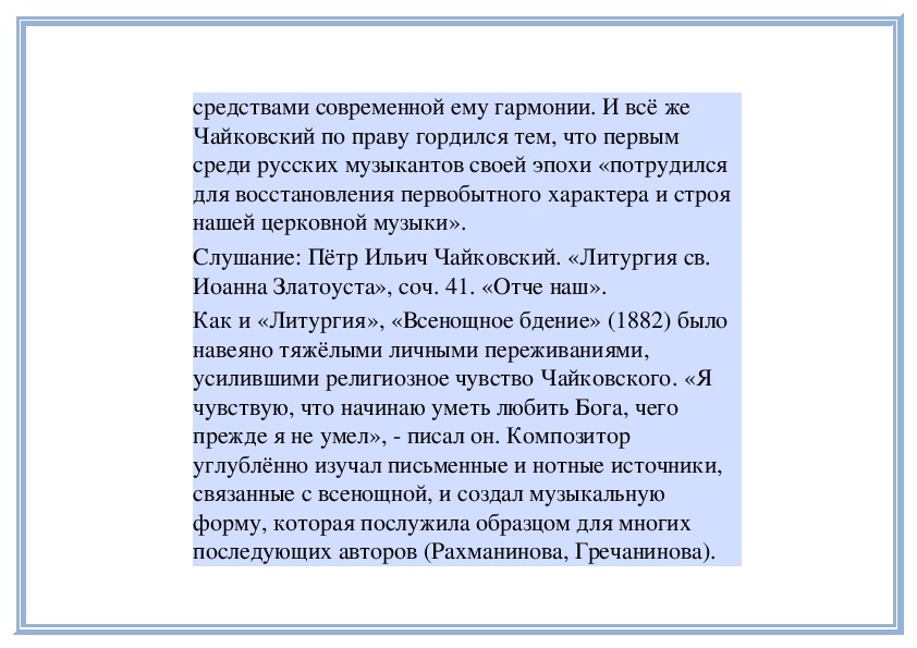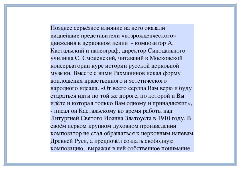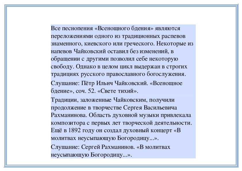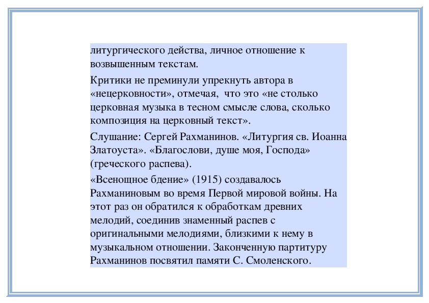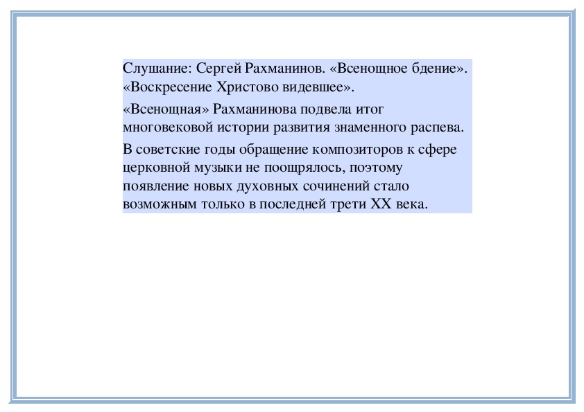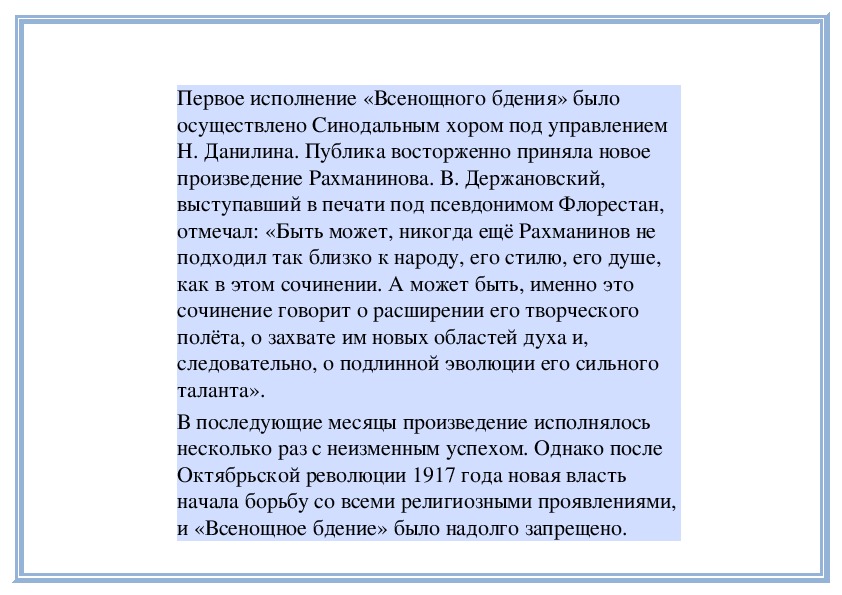 и «Всенощное бдение» было надолго запрещено.Слушание: Сергей Рахманинов. «Всенощное бдение».