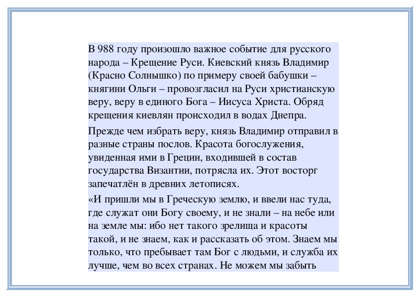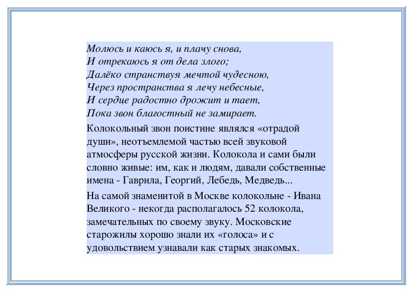 В православной Руси с особой любовью и почитанием относились к колоколам и колокольному звону. Вспомните песню «Вечерний звон», вспомните «Вечерний звон» И. Левитана...