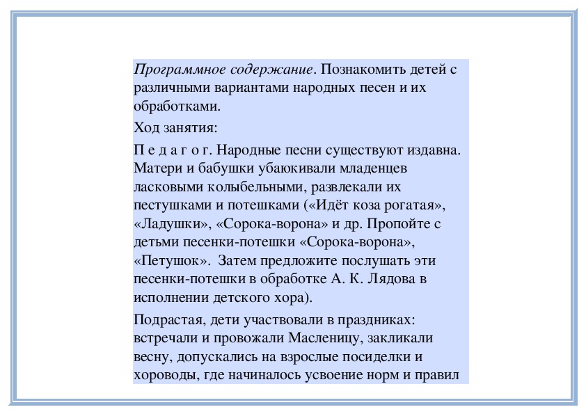 Программное содержание. Рассказать детям о композиторе Г. В. Свиридове. Учить различать жанр колыбельной песни и характер музыки (ласковый, спокойный).