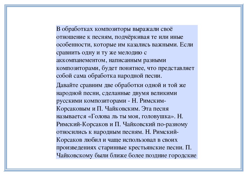 П е д а г о г. Дети, сегодня вы познакомитесь с пьесой замечательного композитора Георгия Васильевича Свиридова. Г. В. Свиридов - один из самых известных советских композиторов. Он был учеником Д. Д. Шостаковича. Главные темы его музыкальных произведений - Родина, поэтические картины родной земли, образы простых людей. Г. Свиридов большую часть своих сочинений написал для хора. Его музыка близка народной и в то же время очень современна. Мелодии всегда яркие, сплетения голосов в хоре рождают интересные, свежие созвучия. В оркестре он часто использует колокольные звучания. Музыка отличается вдумчивостью, серьёзностью.