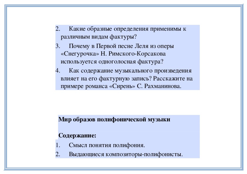 1. Узнавать по характерным признакам (гармонии) музыку отдельных выдающихся композиторов (Н. Римского-Корсакова).