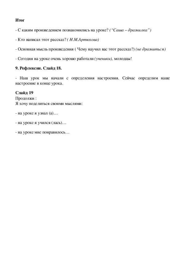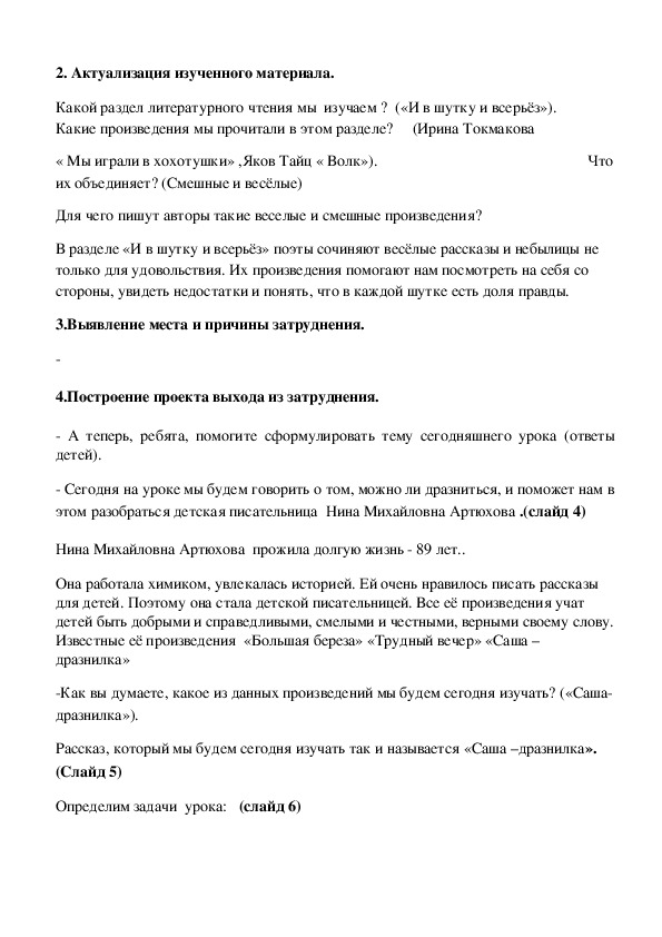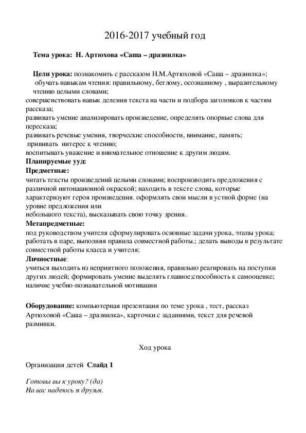 Цели урока: познакомить с рассказом Н.М.Артюховой «Саша – дразнилка»;