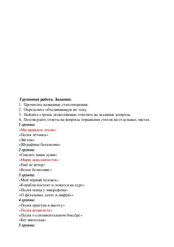 2 группа – Биографы (составить кластер по биографии Высоцкого)3 группа – Аналитики (определяют темы стихотворений Высоцкого)