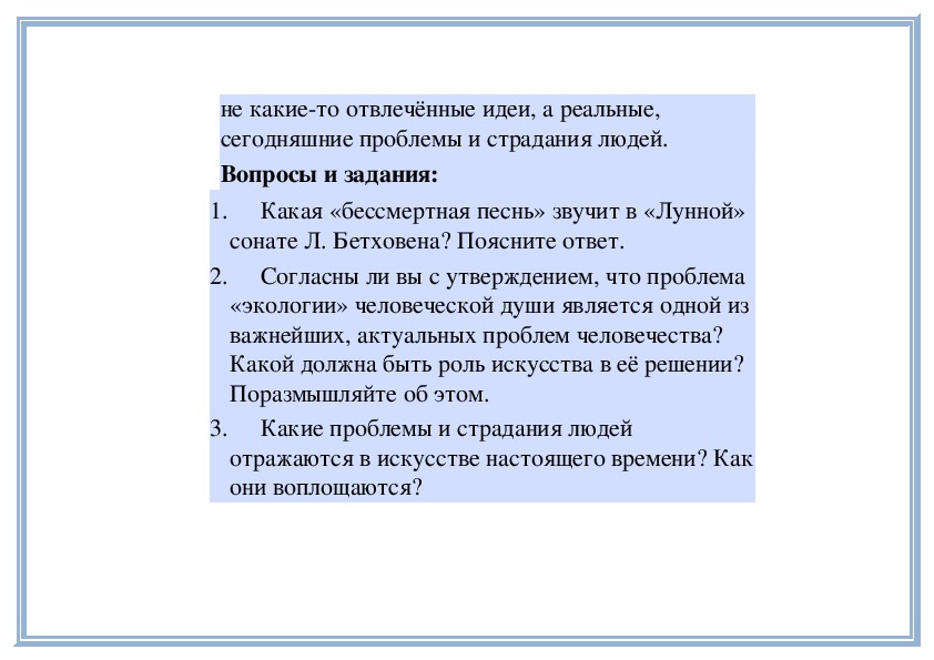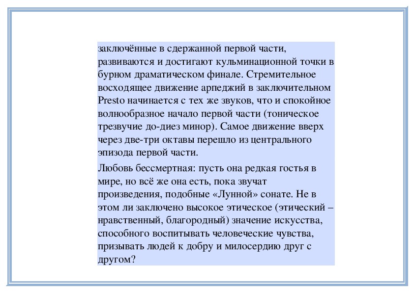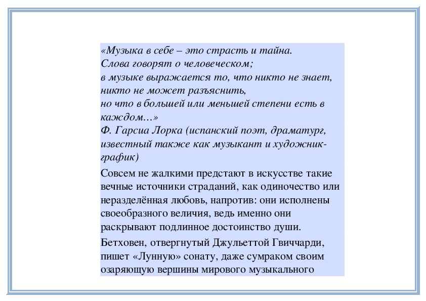 1. Чувства одиночества, неразделённой любви, воплощённые в музыке «Лунной» сонаты Л. Бетховена.