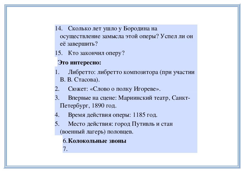 слова: «О, дайте, дайте мне свободу»?14. Сколько лет ушло у Бородина на