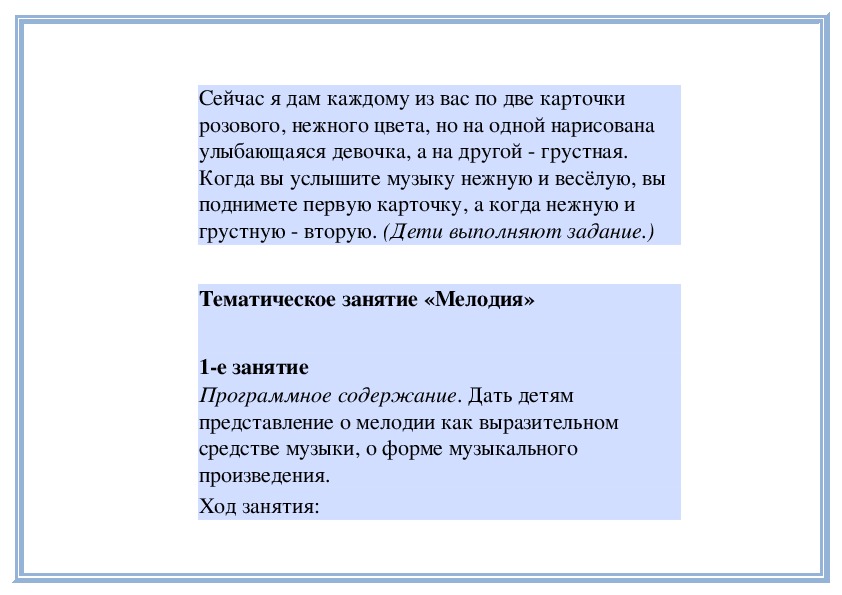 Программное содержание. Рассказать детям о том, что музыка передает разное настроение людей (веселое, грустное, нежное, игривое).