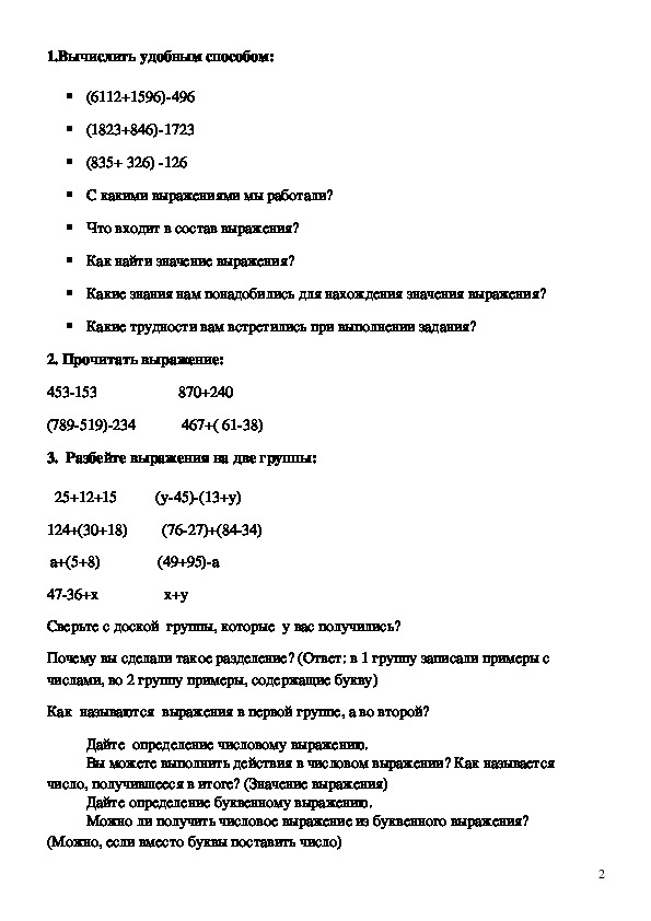 Цели: способствовать формированию знаний учащихся о числовых и буквенных выражениях, значениях выражений, правилах получения буквенного выражения на основе числового; способствовать формированию навыков составления и решения выражений; создать условия для формирования УУД
