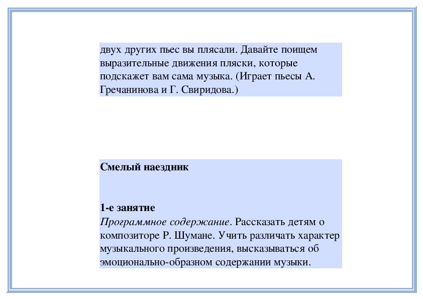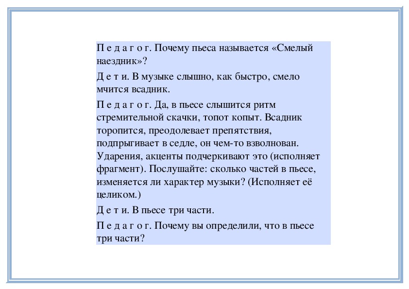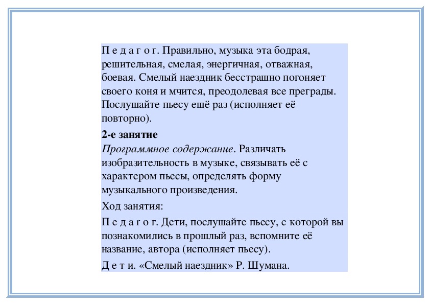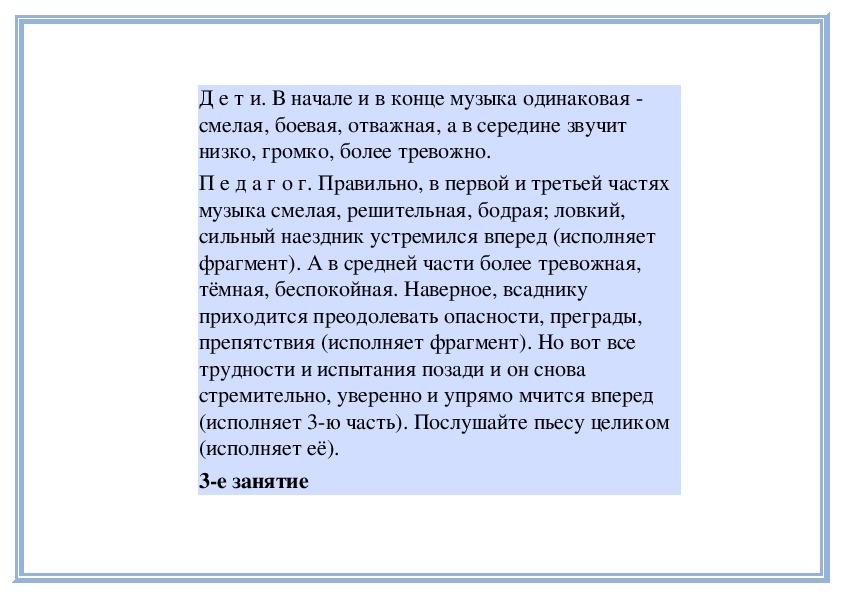 П е д а г о г. Сегодня я познакомлю вас с танцем мазуркой. Каждый танец имеет своё происхождение, свои особенности, проявляющиеся в характере музыки и в характере танцевальных движений. Например, вальс родом из Германии и Австрии, полька - чешский танец. Вальс имеет трёхдольный размер (исполняет фрагмент какою-нибудь вальса и считает до трёх), а полька - двухдольный, под неё можно считать до двух (играет фрагмент).
