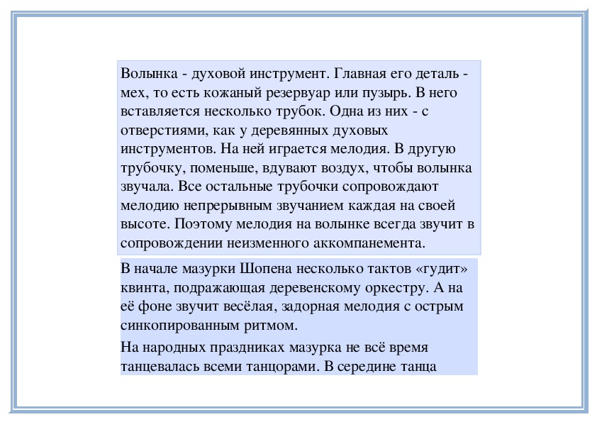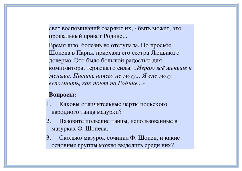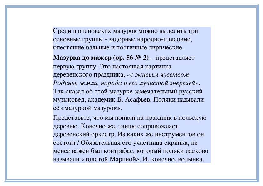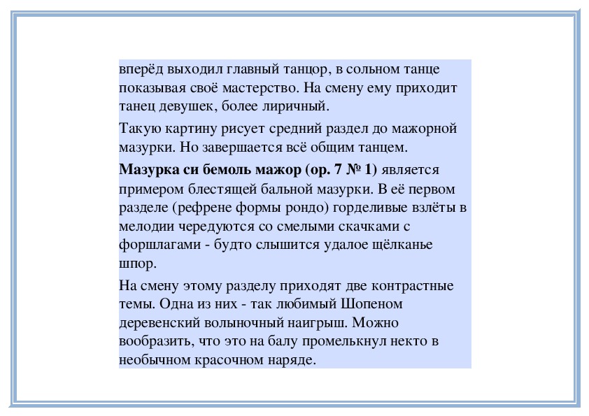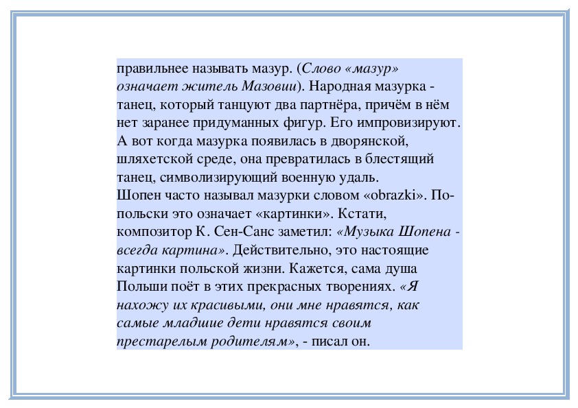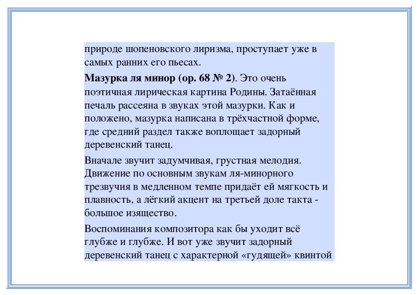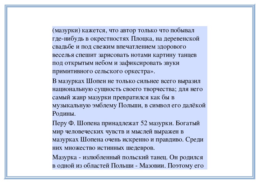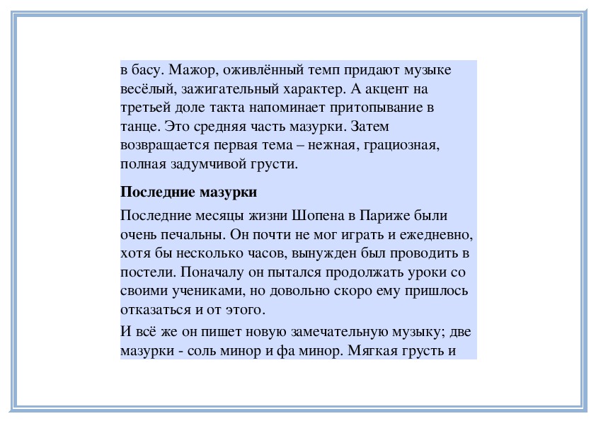 престарелым родителям», писал он.Среди шопеновских мазурок можно выделить три