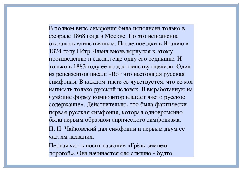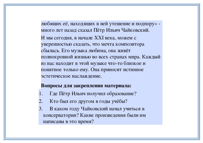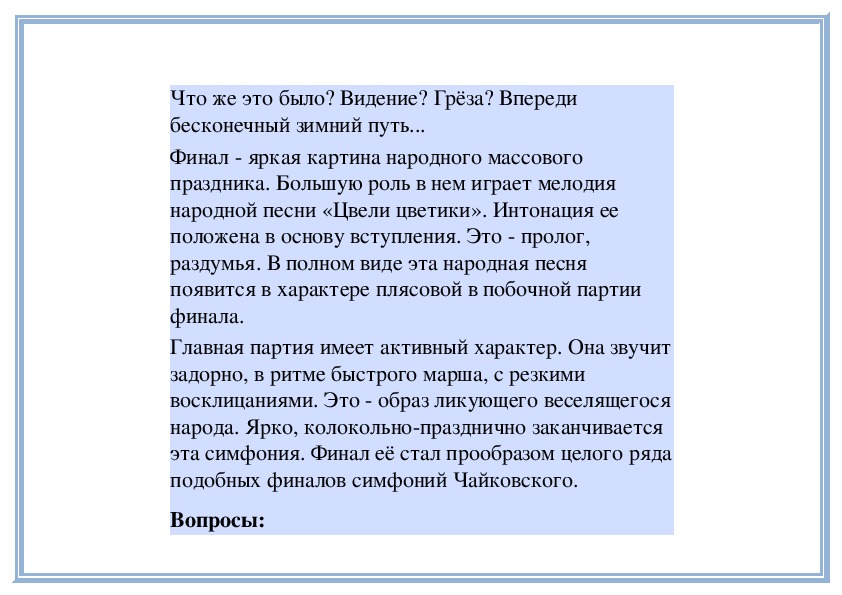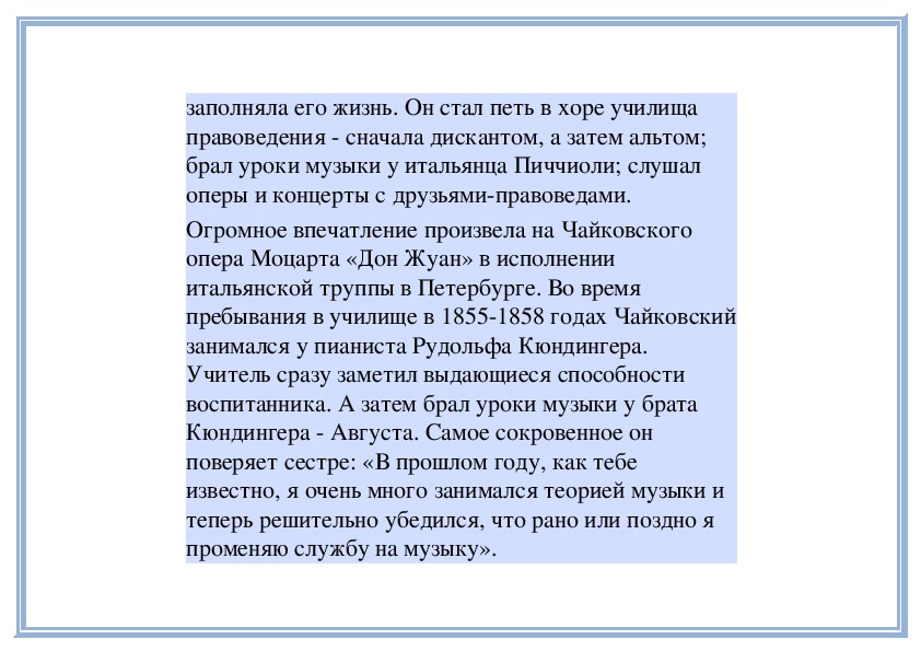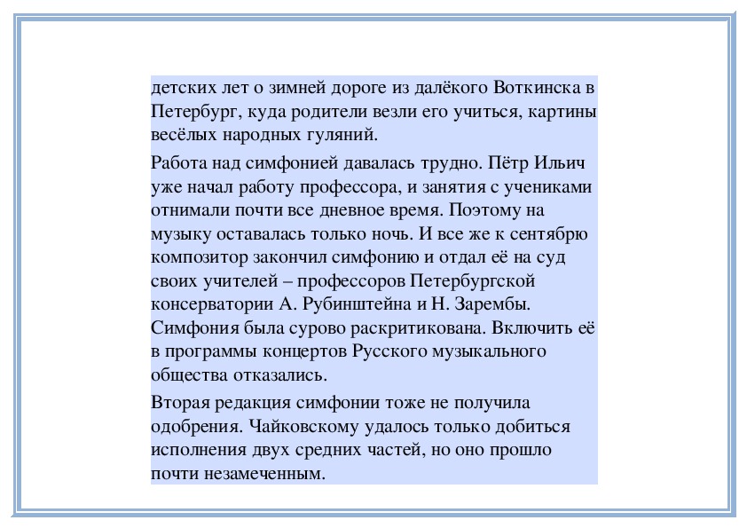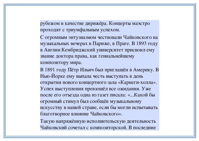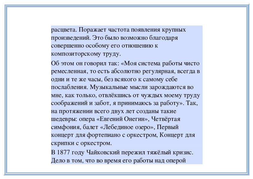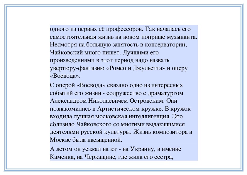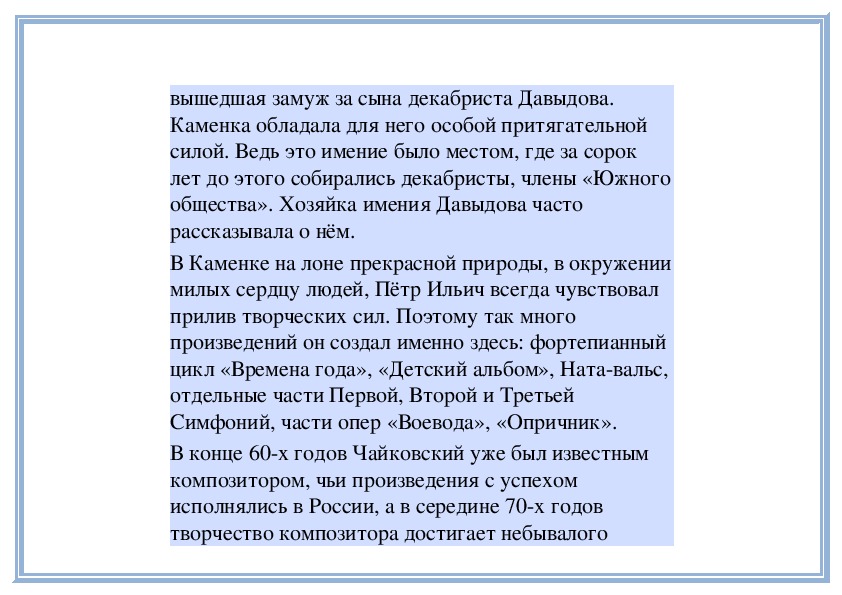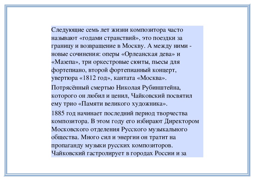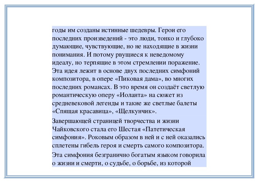 Чайковский сочетал с композиторской. В последниегоды им созданы истинные шедевры. Герои его