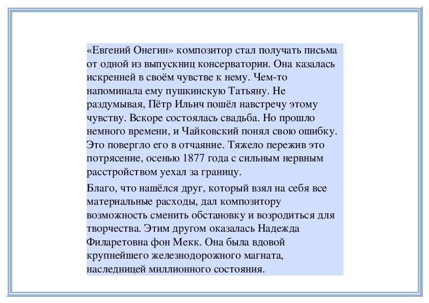 Дело в том, что во время его работы над оперой«Евгений Онегин» композитор стал получать письма