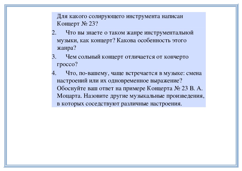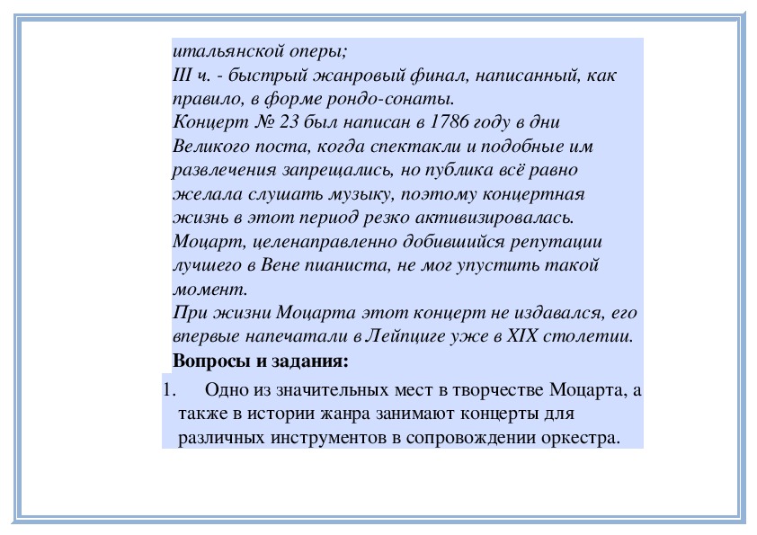 1. В. А. Моцарт. Концерт № 23 для фортепиано с оркестром (слушание);