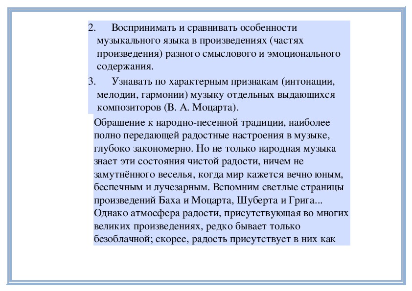 3. Узнавать по характерным признакам (интонации, мелодии, гармонии) музыку отдельных выдающихся композиторов (В. А. Моцарта).