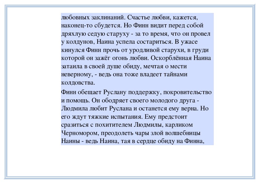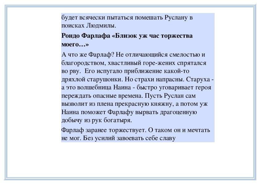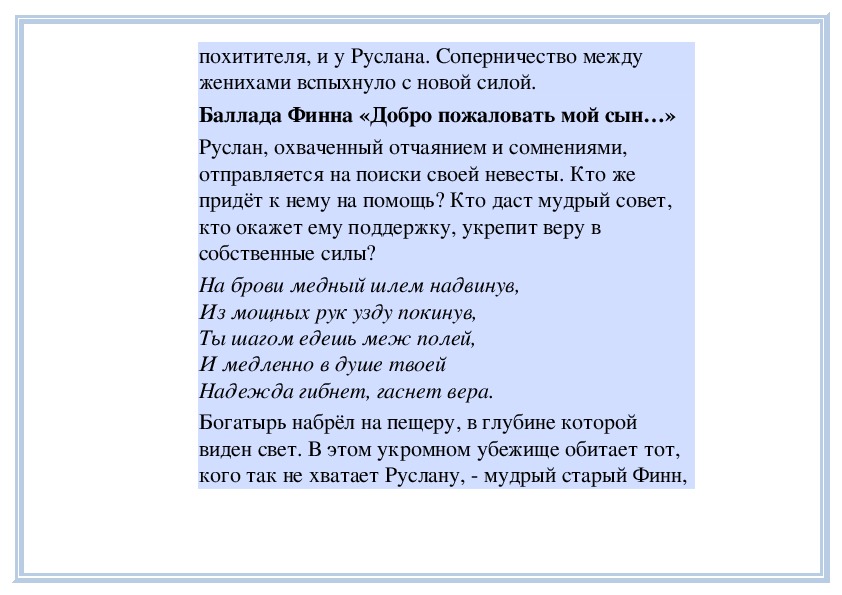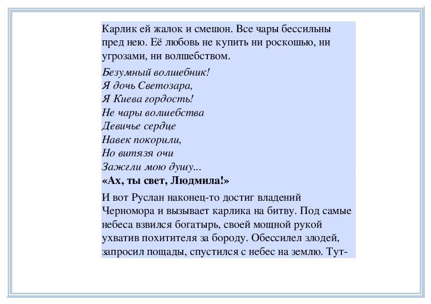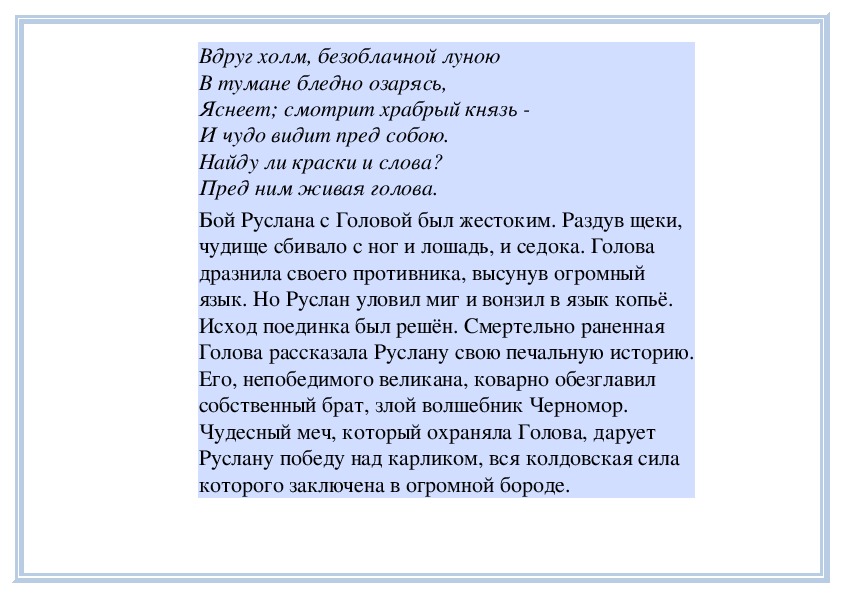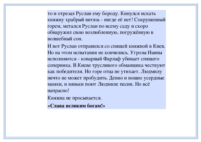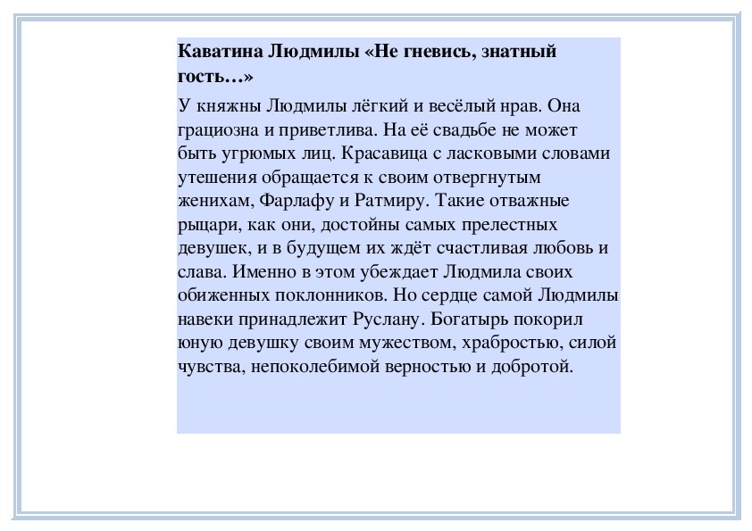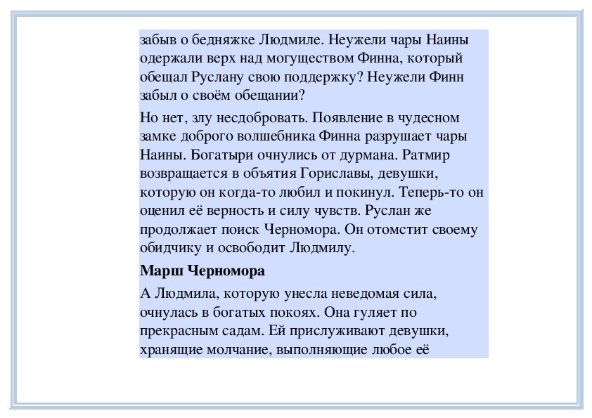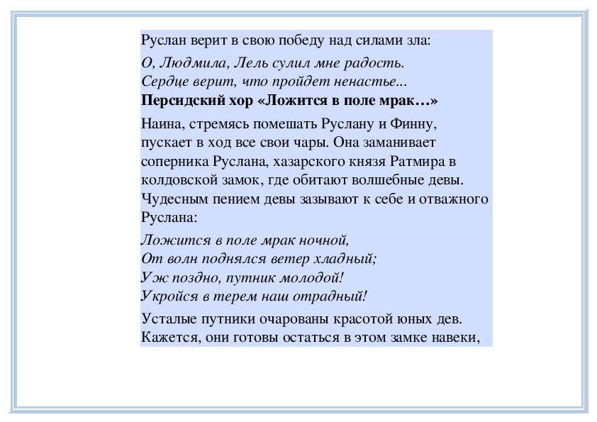Опера «Руслан и Людмила» М. И. Глинки написана на сюжет одноимённой поэмы А. С. Пушкина. В своей поэме Пушкин воспел людей сильных и мужественных, верных и добрых, воспел честность, справедливость и любовь.