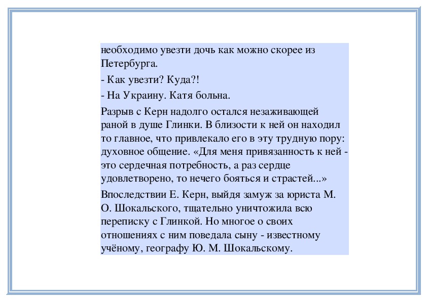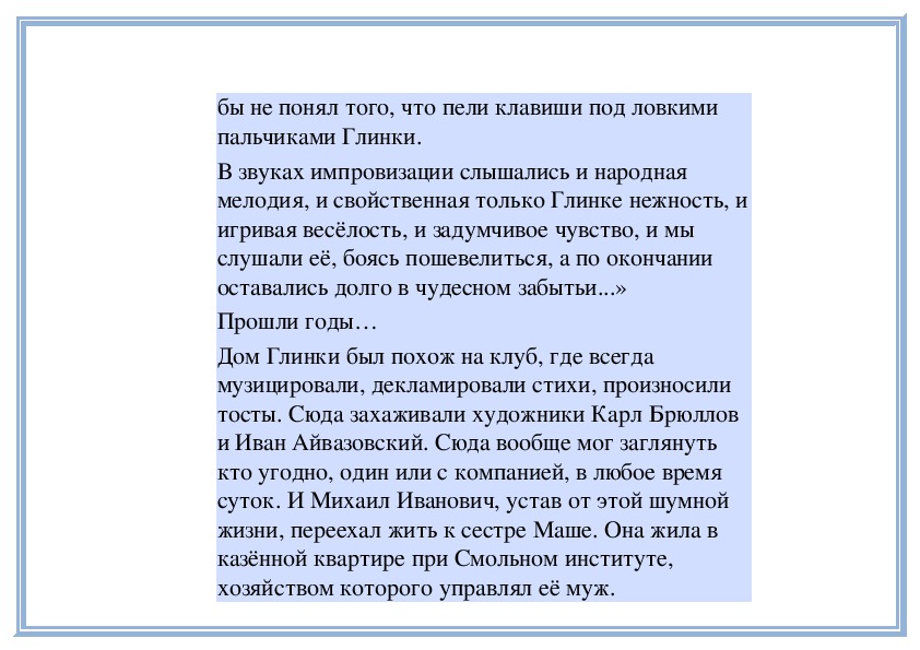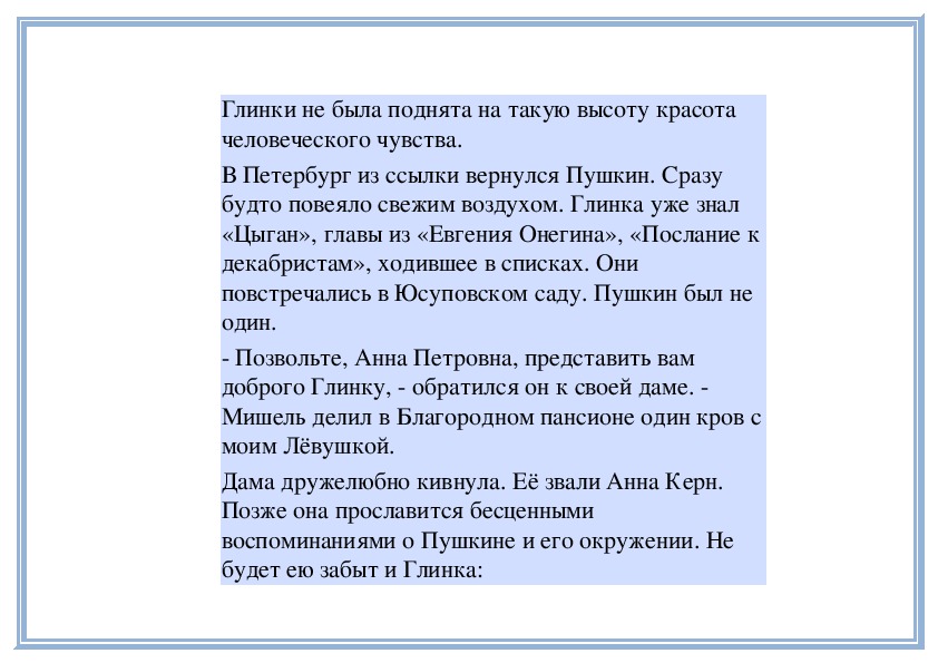 будет ею забыт и Глинка:«Молодой человек небольшого роста, прекрасной