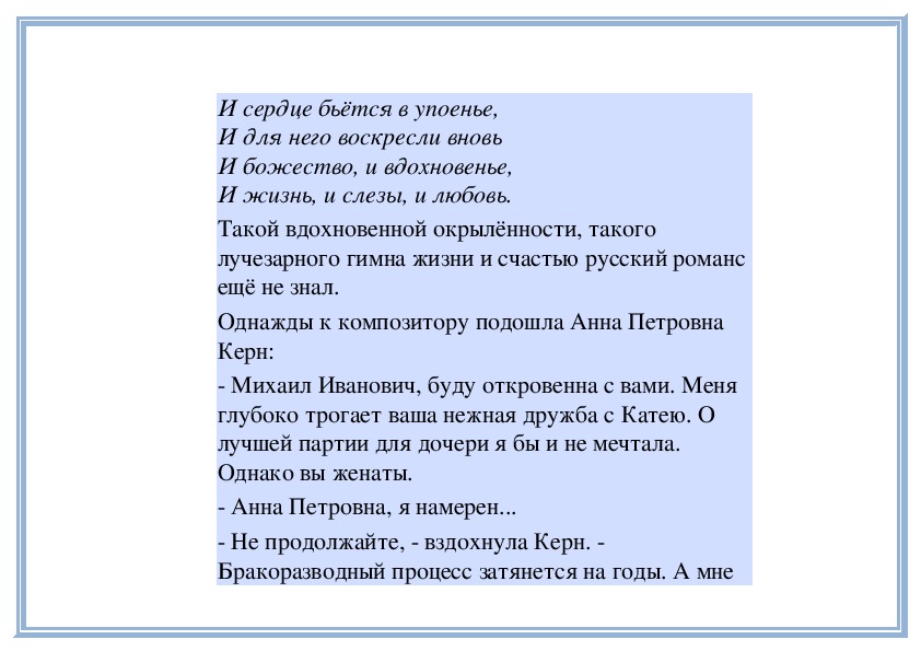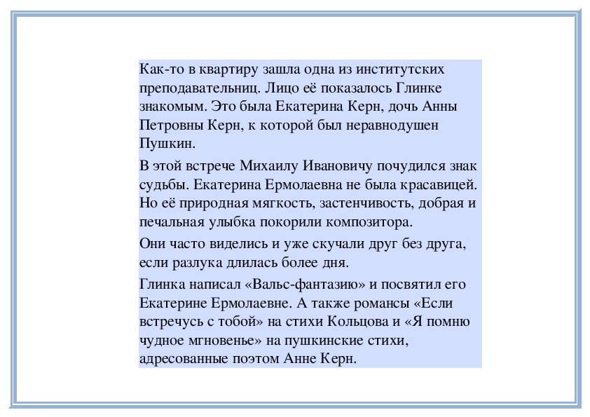 В вокальной лирике Михаила Ивановича Глинки важное место занимают романсы на слова Пушкина. Среди них «Я помню чудное мгновенье» - жемчужина русской вокальной лирики, в которой воедино слились гений поэта и композитора. Трёхчастная форма романса соответствует содержанию стихотворения, в котором отражены три важных момента душевной жизни героя: первая встреча, горечь разлуки с любимой и радость вновь наступившего свидания. Мелодия романса глубоко впечатляет своей плавностью и нежной грацией.