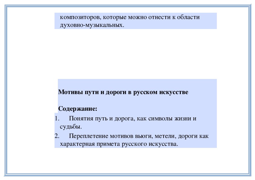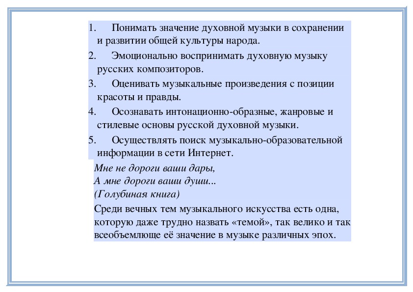 1. Понимать значение духовной музыки в сохранении и развитии общей культуры народа.