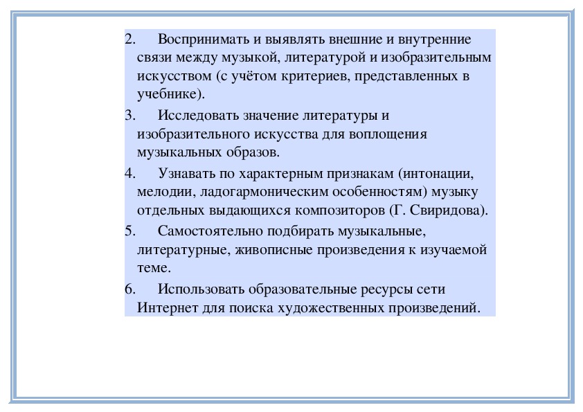 5. Осуществлять поиск музыкально-образовательной информации в сети Интернет.