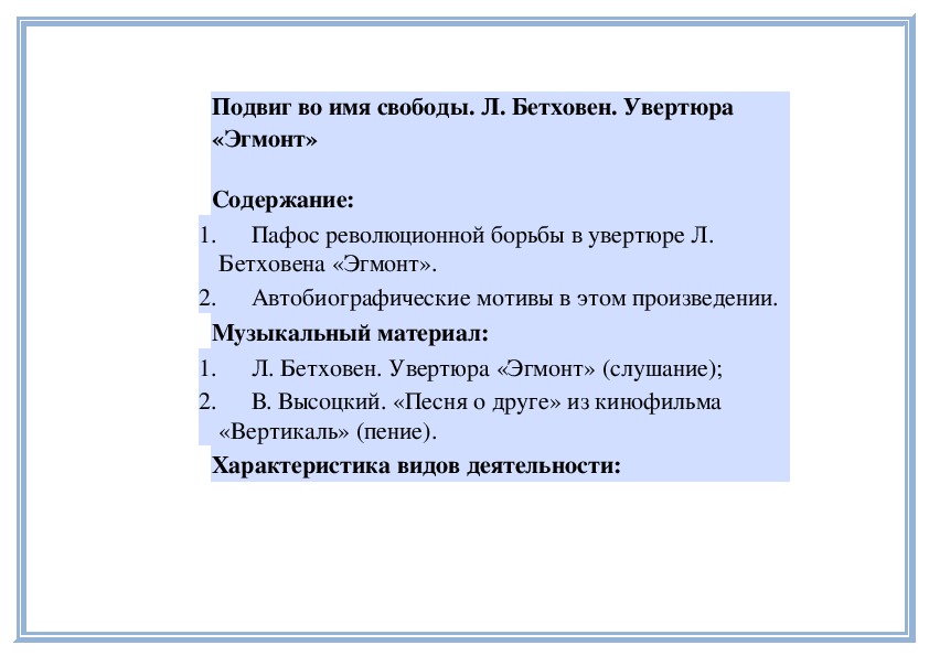Характеристика видов деятельности:1. Понимать значение духовной музыки в сохранении