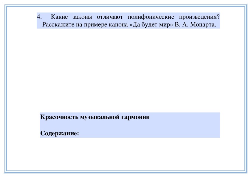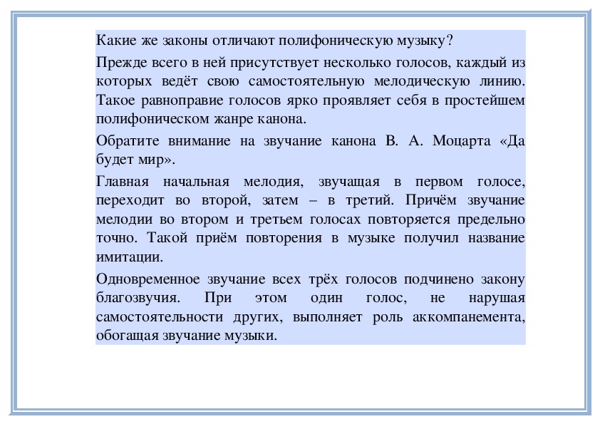 6. Полифонический приём «имитация» (на примере канона В. А. Моцарта «Да будет мир»).