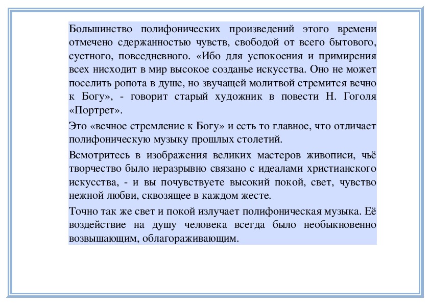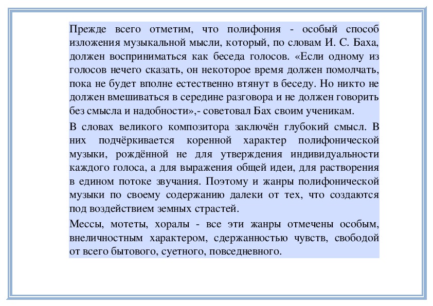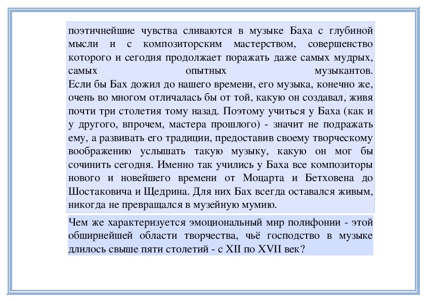 4. Узнавать по характерным признакам (интонации, мелодии, гармонии, полифоническим приёмам) музыку отдельных выдающихся композиторов прошлого (И. С. Баха, В. А. Моцарта).