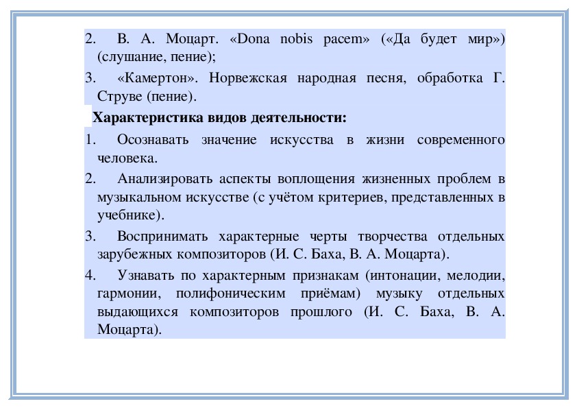 3. Воспринимать характерные черты творчества отдельных зарубежных композиторов (И. С. Баха, В. А. Моцарта).
