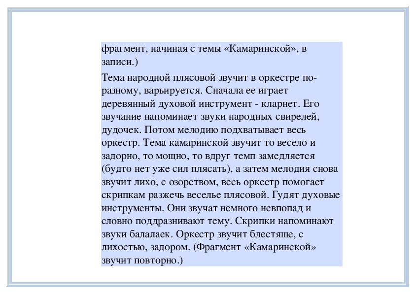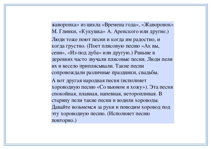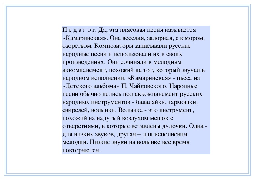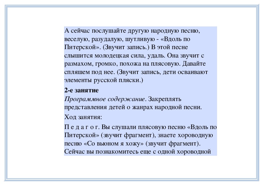П е д а г о г. Вы слушали плясовую песню «Вдоль по