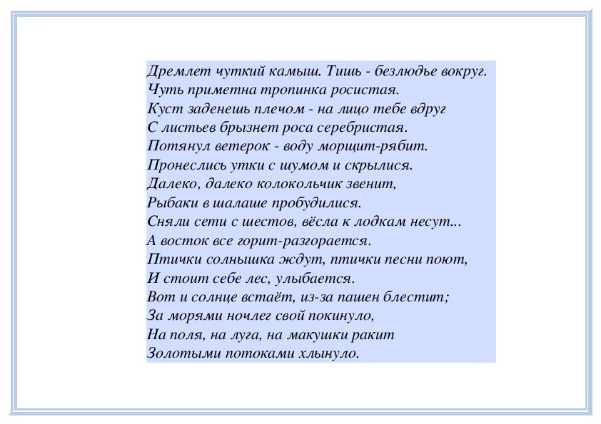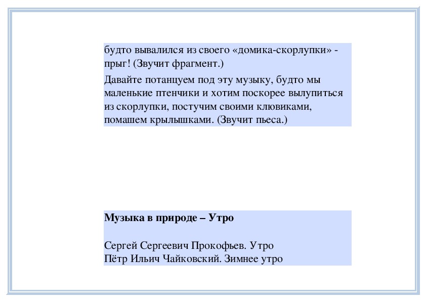 П е д а г о г. Когда вы бывали в лесу, вы, наверное, слышали, как поют птицы? Одни весело щебечут, радуются солнечному дню, поют о том, как красиво вокруг, как им хорошо. Другие поют монотонно, даже немного грустно. Может быть, это птичка-мама баюкает своих маленьких птенчиков или рассказывает им грустную сказку? (Могут прозвучать фрагменты пьес П. Чайковского «Песня жаворонка» из «Детского альбома», «Песнь жаворонка» из цикла «Времена года», «Жаворонок» М. Глинки, «Кукушка» А. Аренского или другие.)