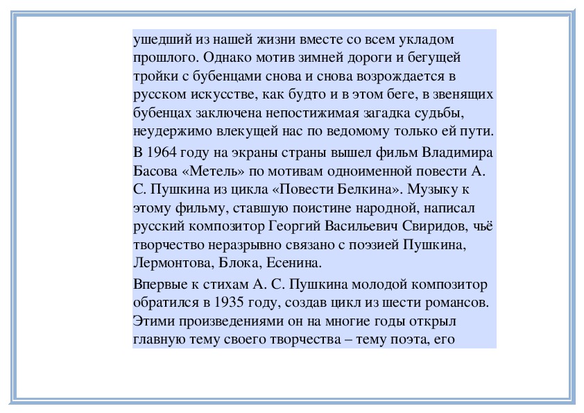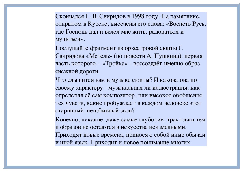 пьесе «Тройка» из оркестровой сюиты Г. Свиридова