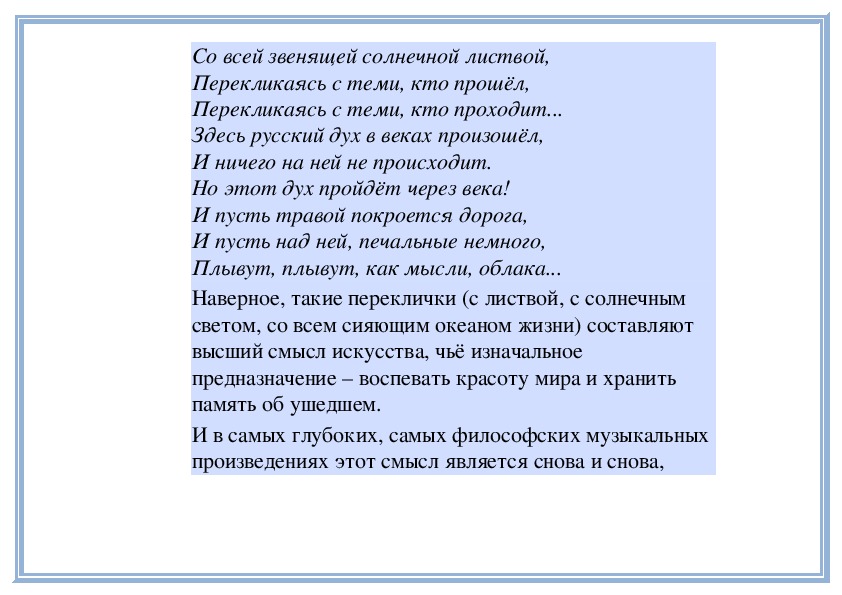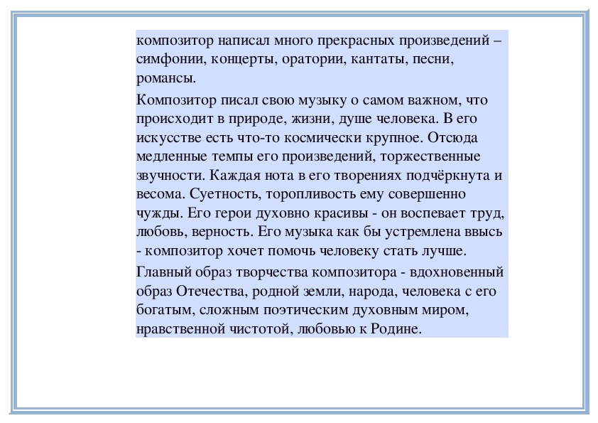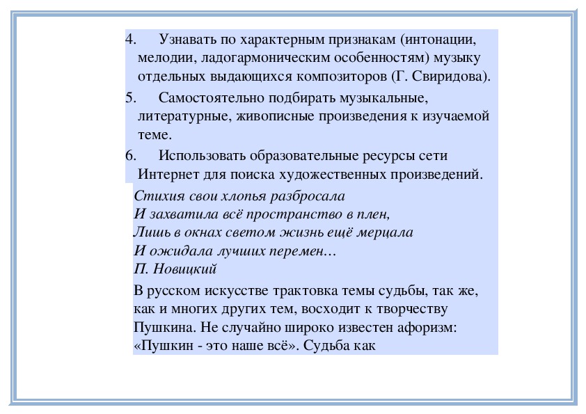 4. Узнавать по характерным признакам (интонации, мелодии, ладогармоническим особенностям) музыку отдельных выдающихся композиторов (Г. Свиридова).