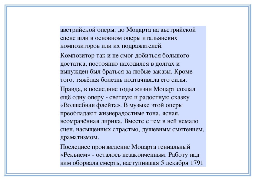 Высочайший взлёт венской школы связан с творчеством гениального Моцарта.