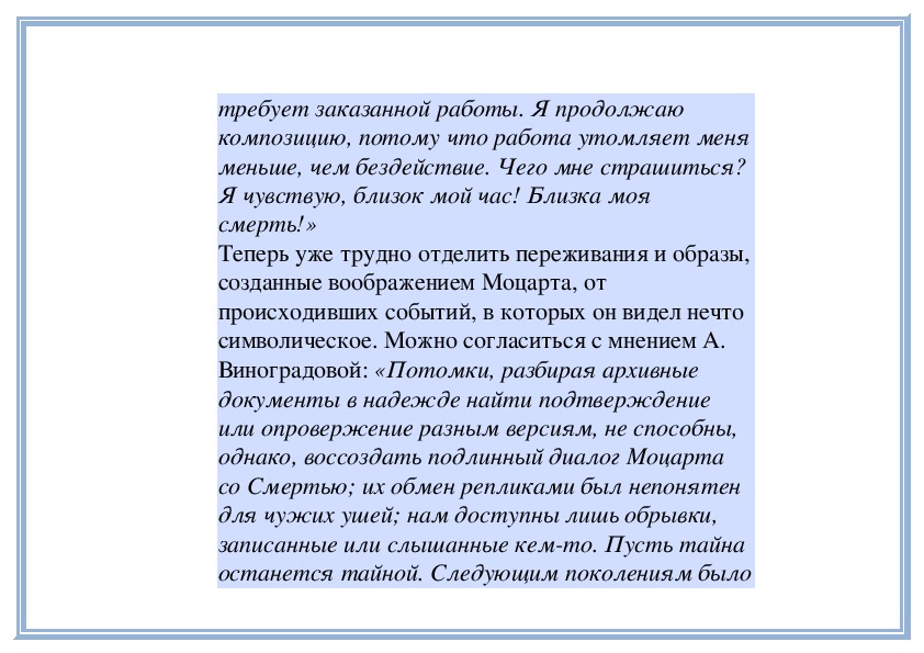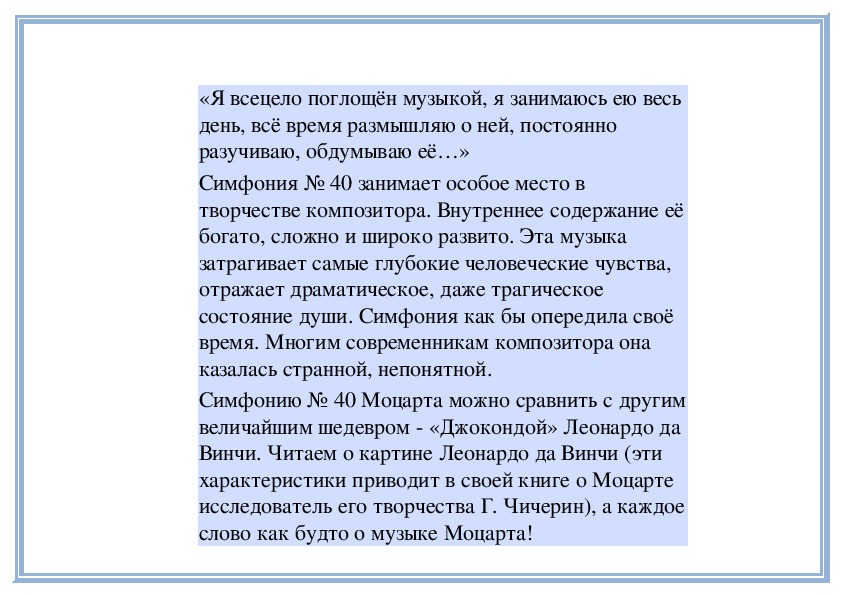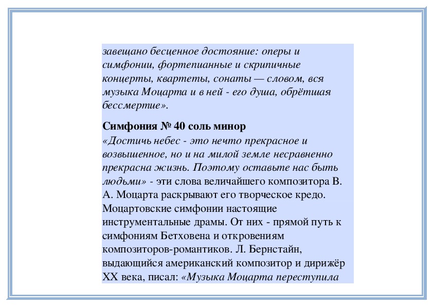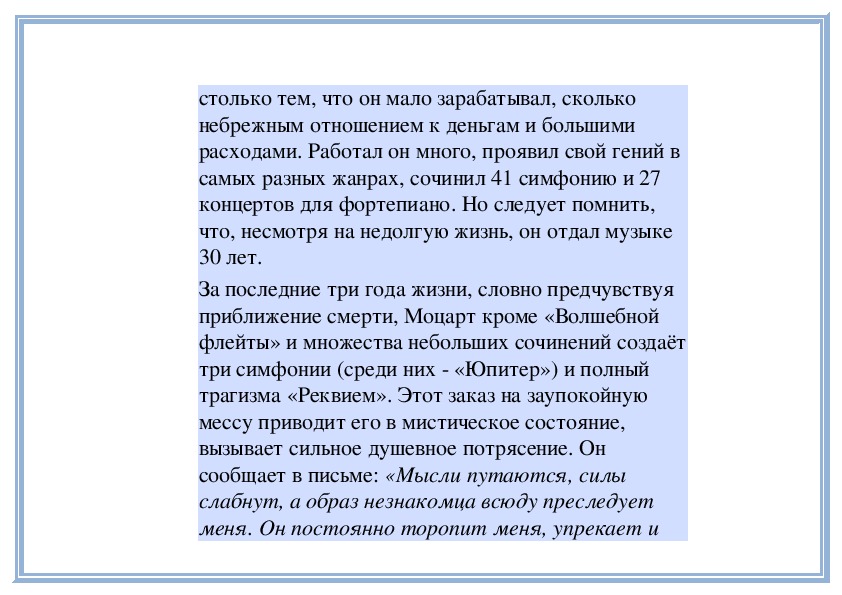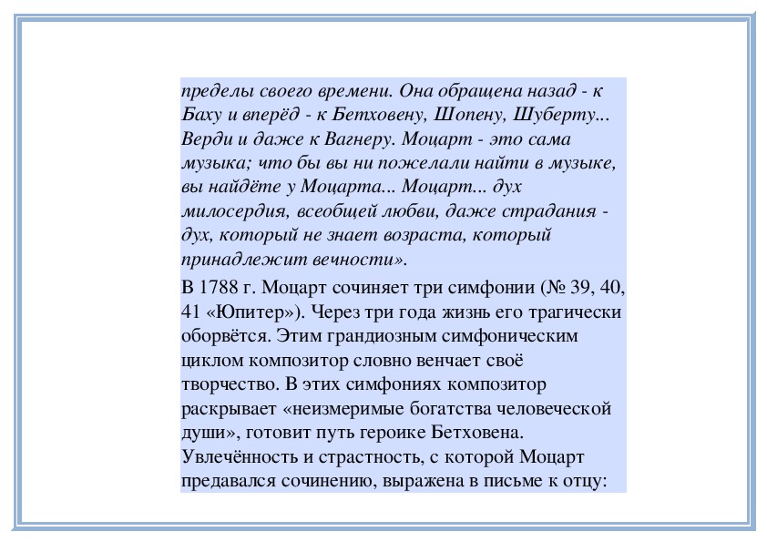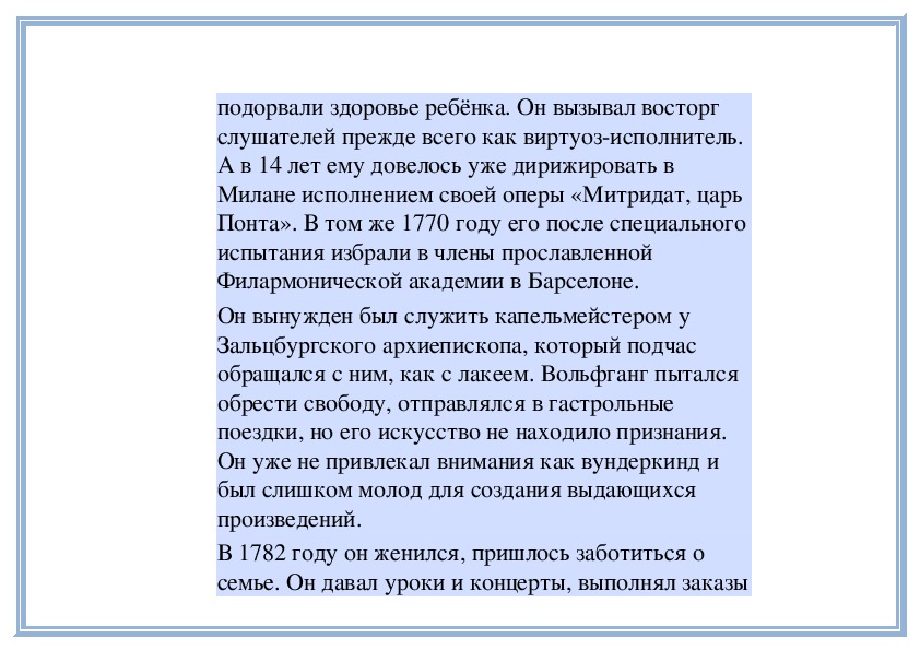 Моцарт - редчайшее явление в мировой культуре. Он был чрезвычайно одарённым ребёнком, имевшим небывалый успех. В подобных случаях очень немногим удаётся сохранить свою яркую индивидуальность, не привыкнув угождать публике.