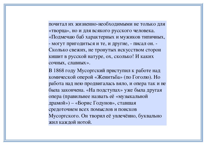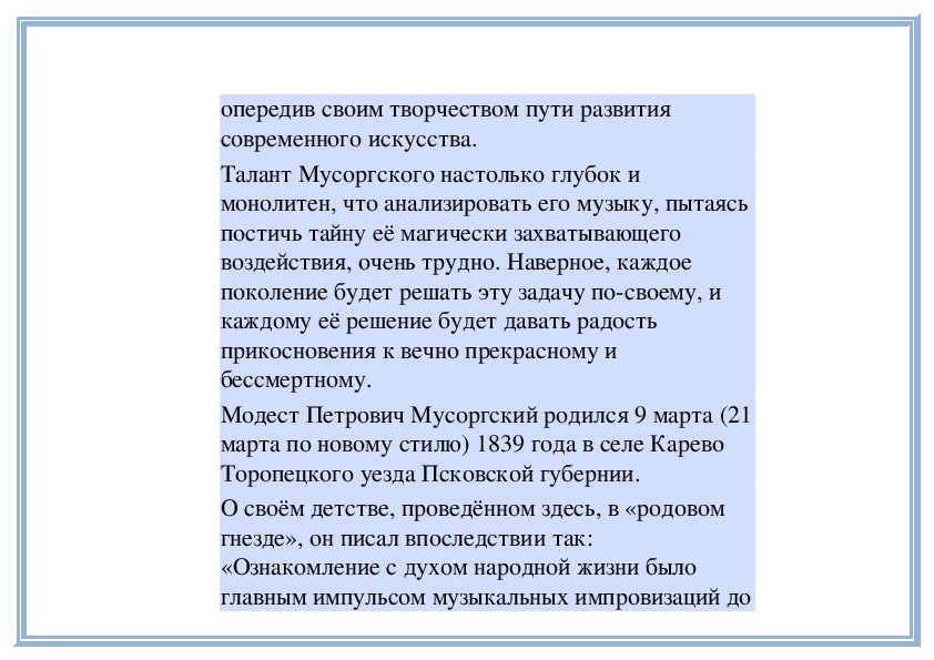 Мусоргский - величайший художник-трагик. И этой главной чертой своего мировоззрения он тесно связан со своей эпохой. Немало энергии потратил композитор, чтобы заставить современников поверить в возможность приблизить музыку к современности, в её способность тревожить не только сердца, но и умы. «Изображение красоты - грубое ребячество», - писал он. Он не стремился смягчить или прикрасить жизненные контрасты, а передавал их во всей подлинной кричащей остроте. Таков был его художественный символ, выраженный в словах: «Жизнь, где бы ни сказалась, правда, как бы ни была солона, смелая, искренняя речь к людям...»
