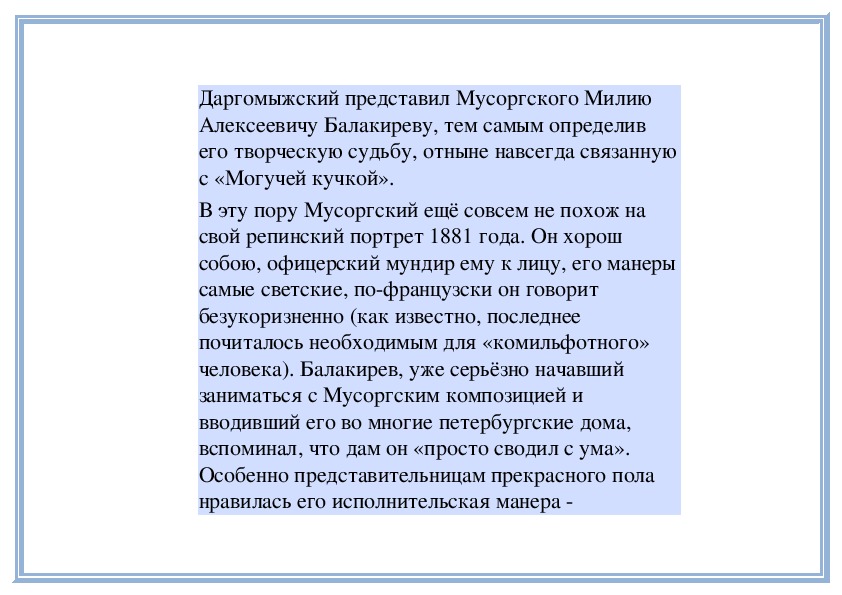 поставлена в Мариинском театре в 1856 году).Даргомыжский представил Мусоргского Милию