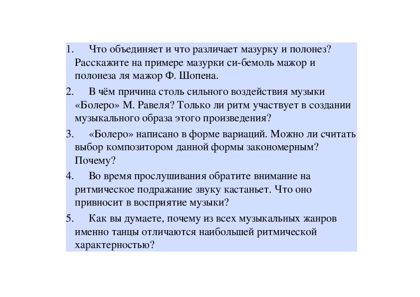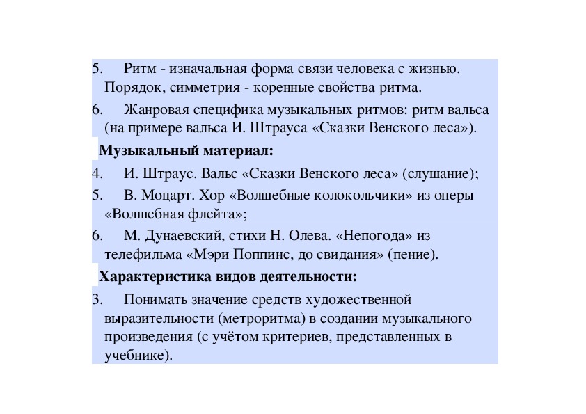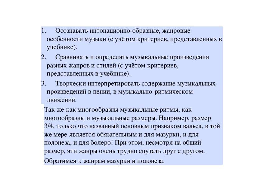 5. Сравнивать музыкальные произведения разных жанров и стилей (с учётом критериев, представленных в учебнике).